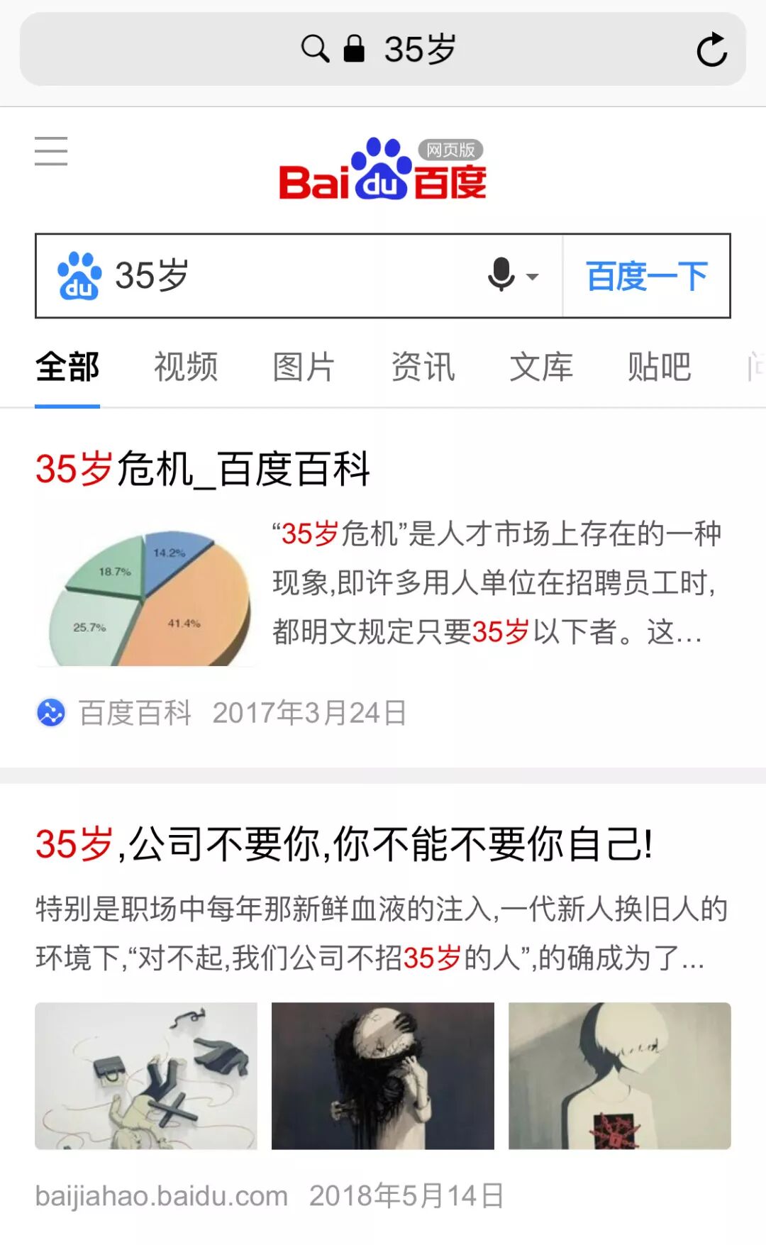 在百度上输入:“35岁”,排在第一位的词条是:35岁危机。接着出现的标题都是: