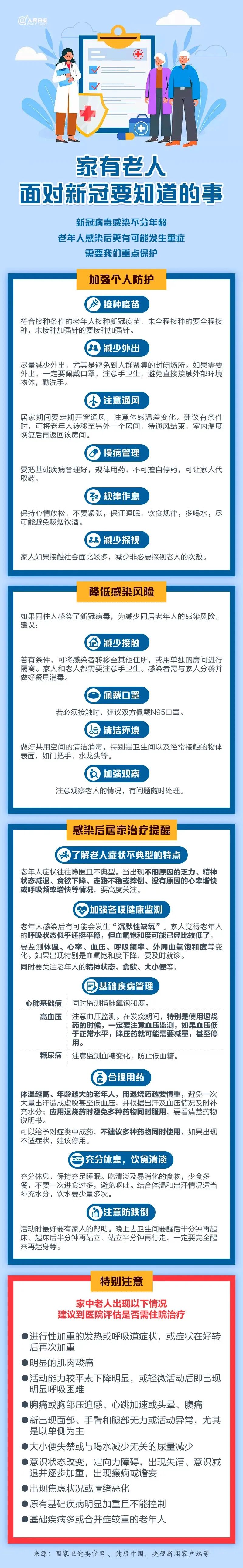 还有一些关于老年人面对新冠的医学常识,大家可以参考一下下面的长图:现在也有一部分老人都阳过了,阳过且没什么事儿的老人,也算是让我们这些做子女的松了一口气。但是,最好还是继续观察一段时间,这段时间里,老年人还是要多休息,清淡饮食、注意补充蛋白质,不要着急运动、跳广场舞啥的,放缓生活和工作的节奏,总之就是先把身体恢复好,其他的之后再说。所以,“得了新冠要坐个月子才行”虽然是一句玩笑话,但我觉得对老年人来说,再多恢复一段时间也不为过。另外,这段时间,还是要多关心一下老年人的心理,其实对于这次感染,他们心里也挺没谱的,如果在身边,就随时关注一下他们的状态,不在身边就多打几个电话,别过多给他们制造焦虑,也别让他们太不当回事,多听听他们说话也是一种缓解。总之,希望老人家们都能平安走过这波疫情,还能陪我们一起度过之后的很多很多年。-END-