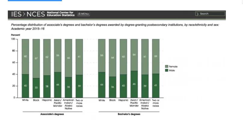 而在大洋彼岸,美国教育统计国家中心数据显示,在2015-16年度,无论白、黑、黄、棕、混血任何人种,无论专科还是本科,获得学历的女性人数都超越了男性。