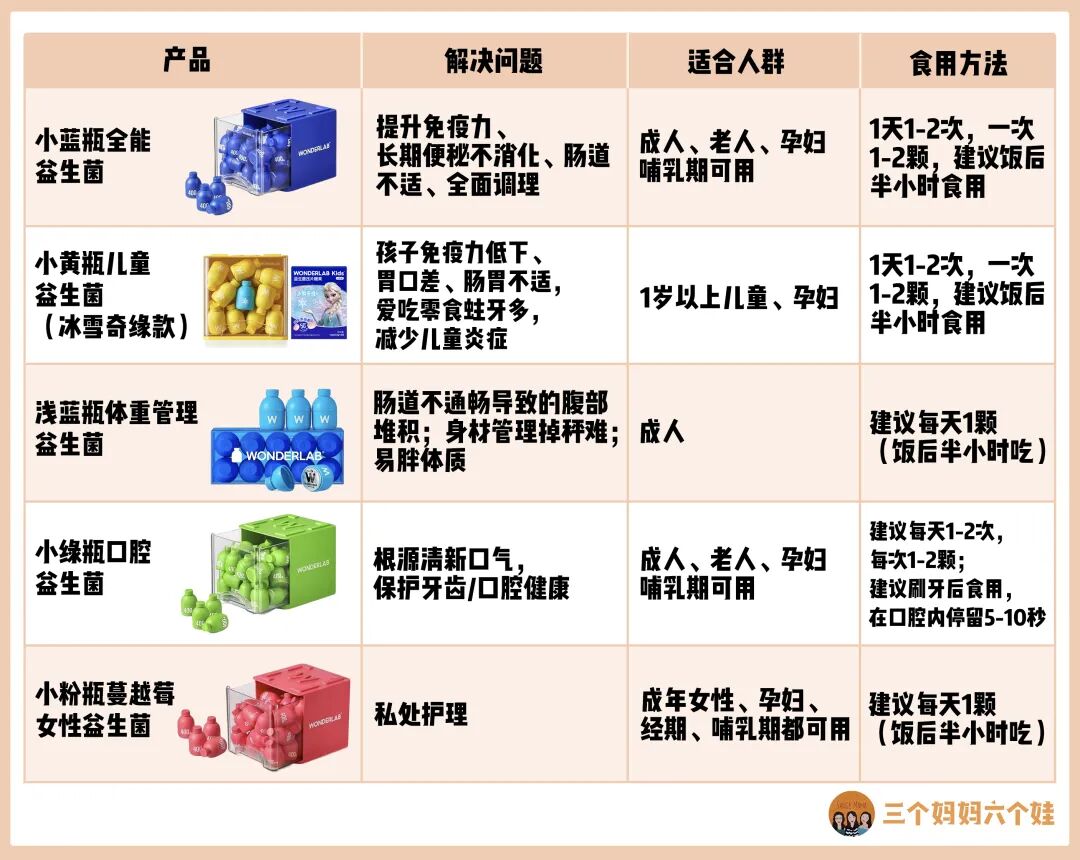 他们用自有十万级的洁净车间来进行高标准生产,这是很多品牌都做不到的,比如小黄瓶就是广东省首家通过婴幼儿辅食生产资质的工厂,生产标准非常高。他们家的即食益生菌粉,是自有专利活性舱,采用了包埋技术,减少水分空气对益生菌的损害,像我自己在吃的小蓝瓶,到达肠胃的存活率就有98%。小蓝瓶有400亿的活菌,小黄瓶有200亿活菌,含量都是比较高的,并且里面所有的菌株,每一个都有编号。除了效果以外,选WonderLab其实还有一个很重要的原因,它是益生菌的大品牌。这几年WonderLab的益生菌在各个平台的销量累计卖出1亿瓶,非常受大家欢迎,在整个行业里面也是远远超过其他品牌的。并且WonderLab生产的工厂也是行业内靠谱的原料大厂。小蓝瓶的菌株原料是来自全球top3的益生菌原料工厂杜邦。研发团队对菌株配方也考虑的很周到,把提高免疫力和帮助消化的菌株复配,一边给肠胃做调理,一边给身体做升级。小蓝瓶和小黄瓶这两款也是我特别推荐的,稳定肠道、提高免疫力都比较不错,大家真的可以入组合装试一试。平时喜欢重口味、火锅、外卖,家里也要常备一些,调理肠胃。现在益生菌越来越紧俏,价格也在涨,大家一定要趁现在优惠力度大多囤一些,特别是组合装,这次我和品牌方要的都是超值价,下次入手真的不能保证还是这个价格,这种刚需品还是尽早囤。了解WonderLab家产品的妈妈们应该知道,他们家的益生菌种类真的非常多。除了提升免疫力的益生菌,对女性也特别友好,比如节后的体重管理,还有一些口气问题、女性健康等等,都有对应的益生菌来负责调节。这次也给大家一次性都安排上了,下面咱们一个一个来说:食用方法:1天1-2次,一次1-2颗,建议饭后半小时食用。WonderLab家每一种益生菌我都吃过,最最喜欢的还是全能小蓝瓶,也是囤货最多的。从专业上说,我觉得全能益生菌这个名字也很贴切,因为它的功能不只是调理肠道这么简单。足量400亿的活性益生菌也能实打实地补充益生菌,可以加速肠道的新陈代谢,提高免疫力,稳住身体状态,所以我建议大家越早补益生菌越好。里面的6种菌株都有一些“绝活”,特别是乳双歧杆菌HN019,它像专门给消化系统准备的守护者一样,可以把那些对肠胃有害的菌群都赶走,让肠道的环境变好,提高活力。