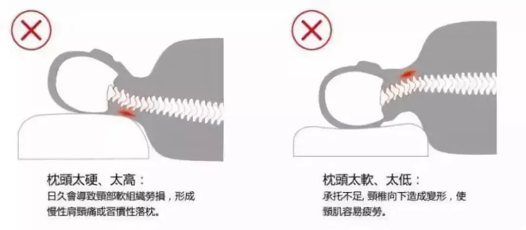 长期睡高枕,就如同被动保持低头姿势。过低、过平的枕头,会使脖子处于仰伸状态,易造成浮肿。由于人睡觉时喜欢左右翻转,要注意保持枕头宽度,避免半夜没有了枕头睡。