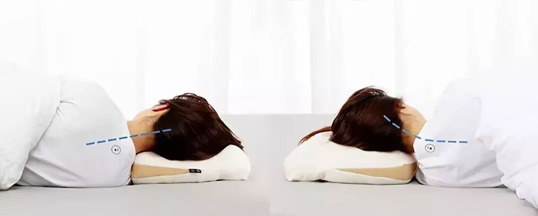 侧睡时,枕头最佳厚度约等于人的肩宽。图左是一个契合肩宽的枕头,侧睡时可以让肩放松,头和背的中心点基本处于直线。图右的枕头厚度不够,侧睡时脖子悬空,左右肩膀都紧张地缩起来了。