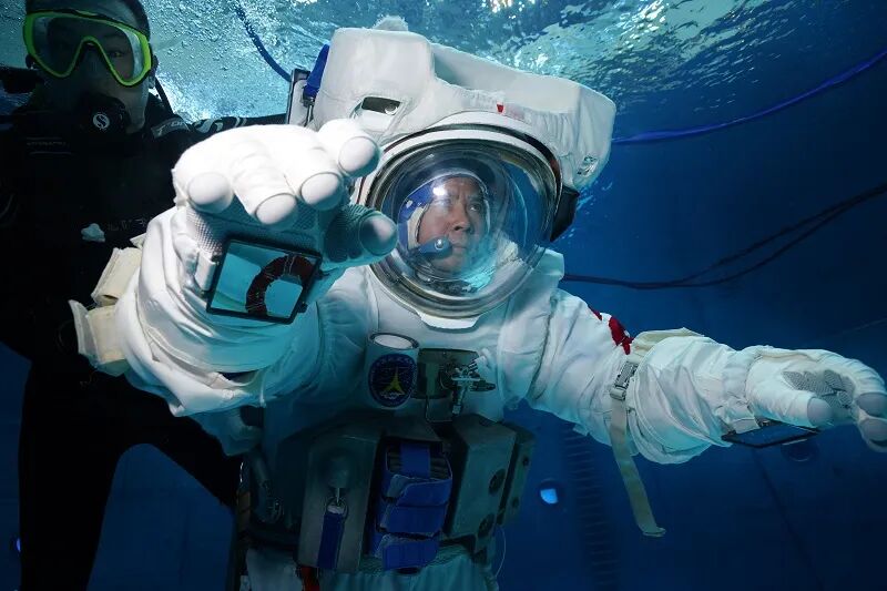 在圆形的模拟失重水槽中,航天员穿着数百公斤的水下服悬浮在蓝色的深水中,这是航天员训练时间最长,体力消耗最大的一项训练。水下训练服是刚性结构,相当于一个“人”形飞船,四肢被固定在水下服里一练就是五六个小时,痒了痛了都只能咬牙坚持,每次训练都是对体能极限的挑战。