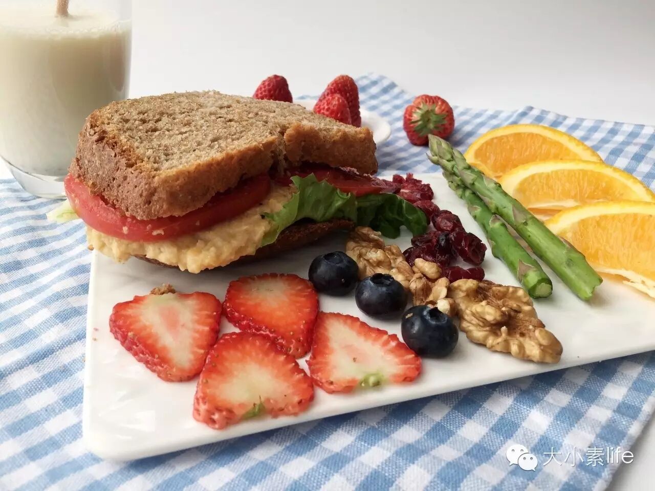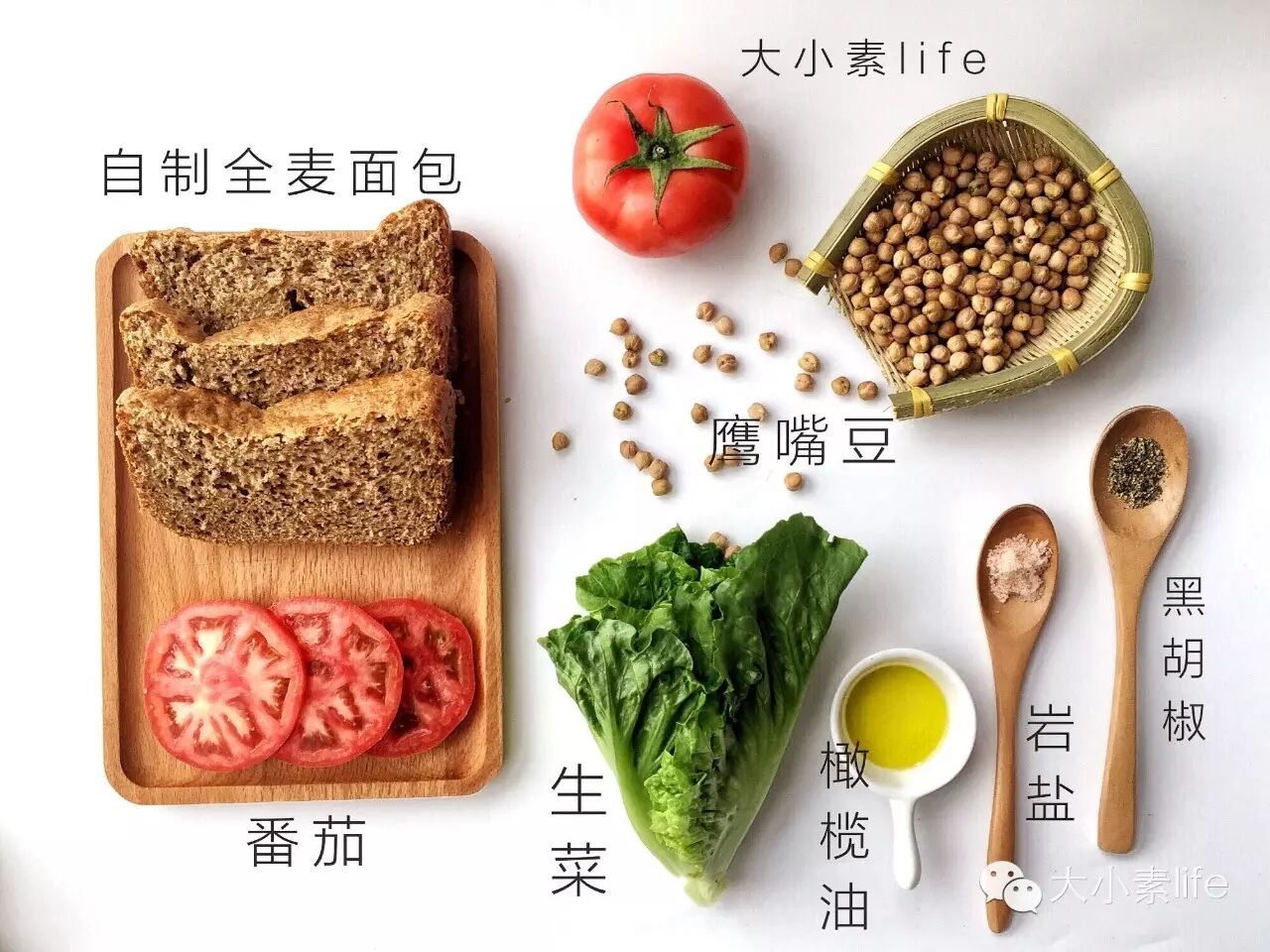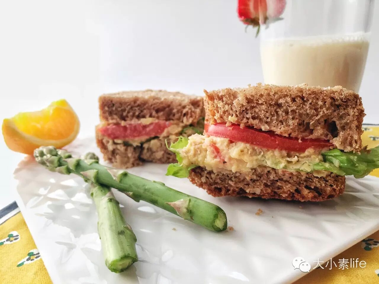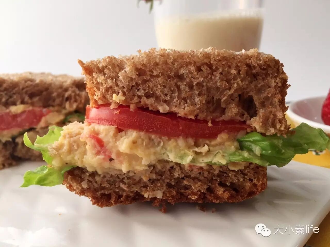 5、鹰嘴豆打成泥后,先拿一片全麦面包放上生菜、鹰嘴豆泥、番茄,最后放上一片面包,一款三文治鹰嘴豆泥就做好了。