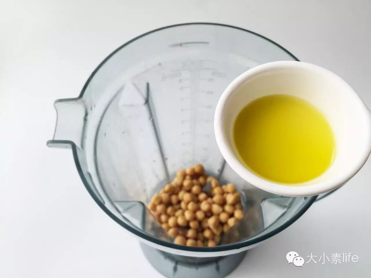 1、提前一晚将鹰嘴豆用过滤水泡过夜,将泡发后的鹰嘴豆倒进压力锅压足20分钟,再倒进营养料理机,加入橄榄油;