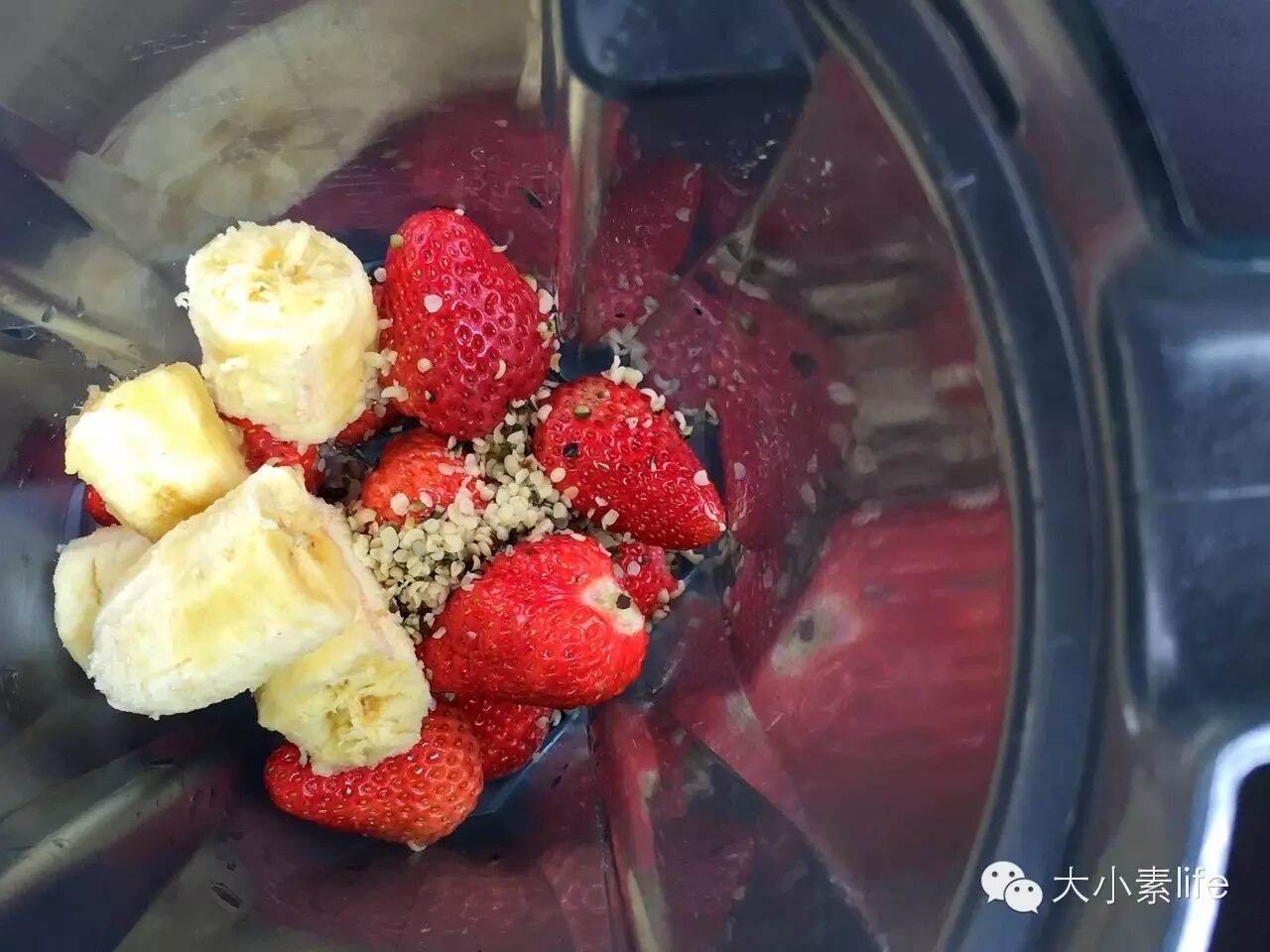2、将火麻仁、香蕉、30g椰奶、龙舌兰糖浆、草莓(喜欢酸感强的可以多放些草莓,少放椰奶和龙舌兰糖浆)倒进营养料理机中进行破壁,打得越细口感越好哦,备用;