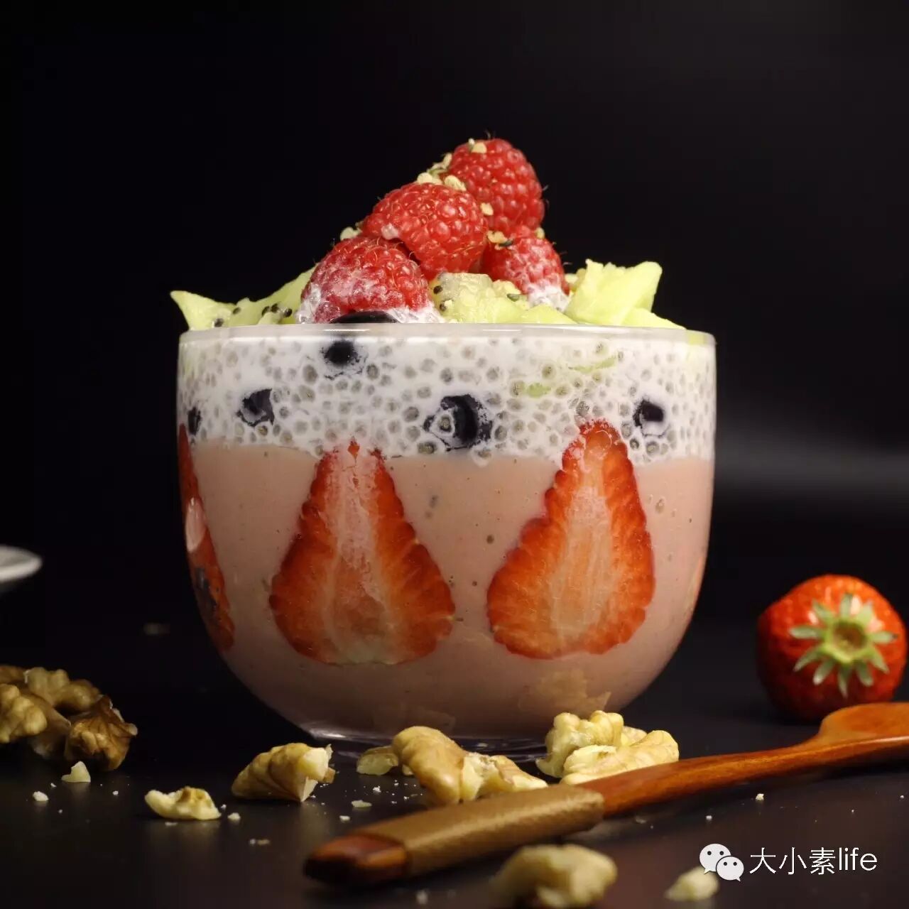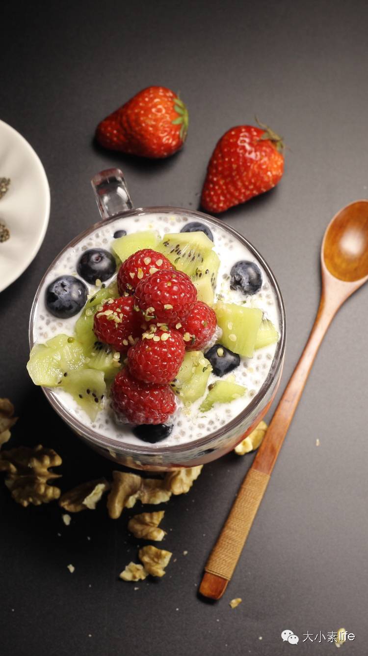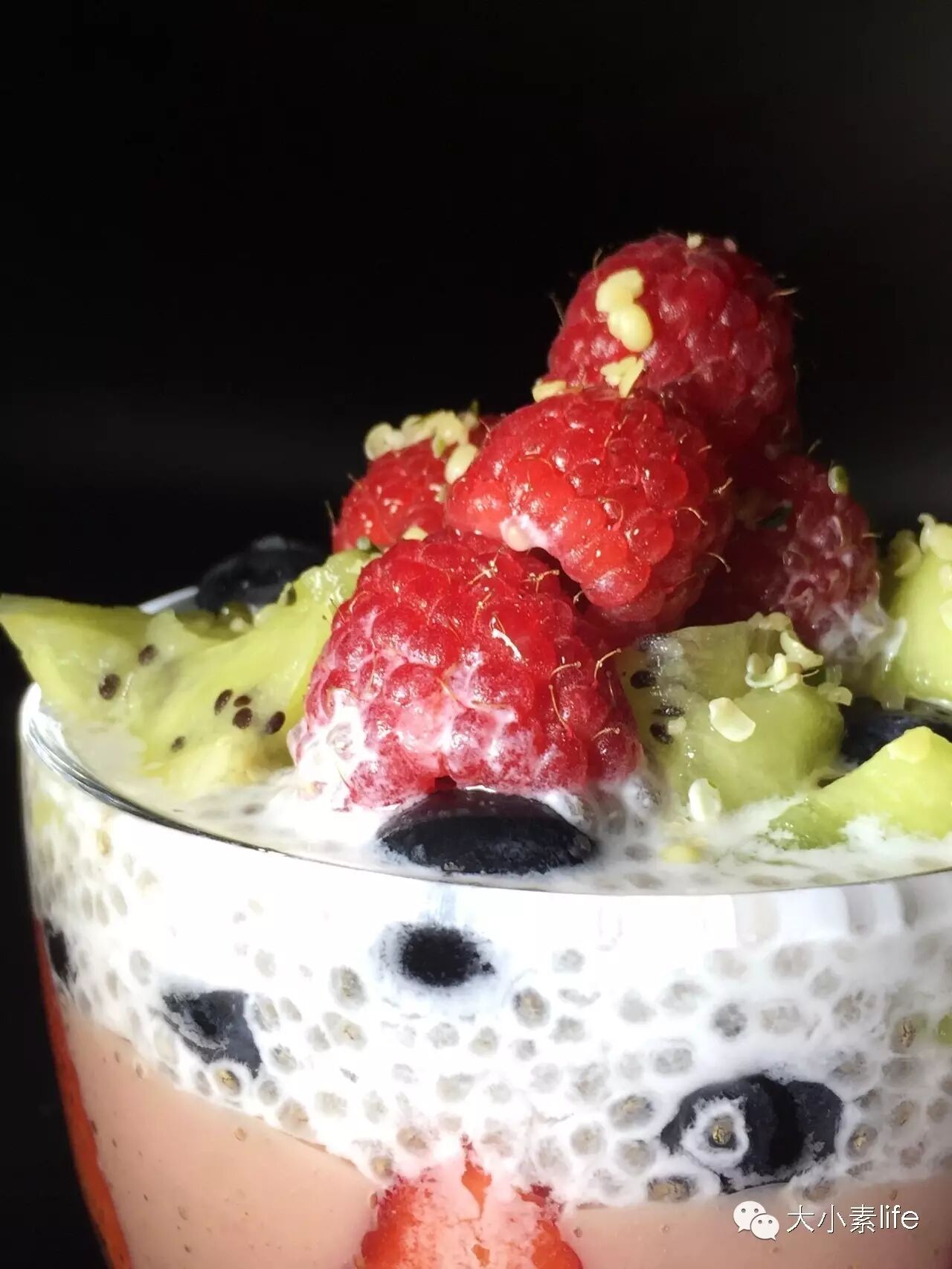 3、将奇亚籽用水泡上两个小时以上,泡发完后的奇亚籽和适量椰奶单独倒进杯子进行搅拌均匀备用。再将破壁好的果昔倒进杯子中,再淋上搅拌好的奇亚籽和椰奶,最后铺上奇异果、蓝莓、树莓、火麻仁即可,一杯美味又好喝的果昔就做好啦!