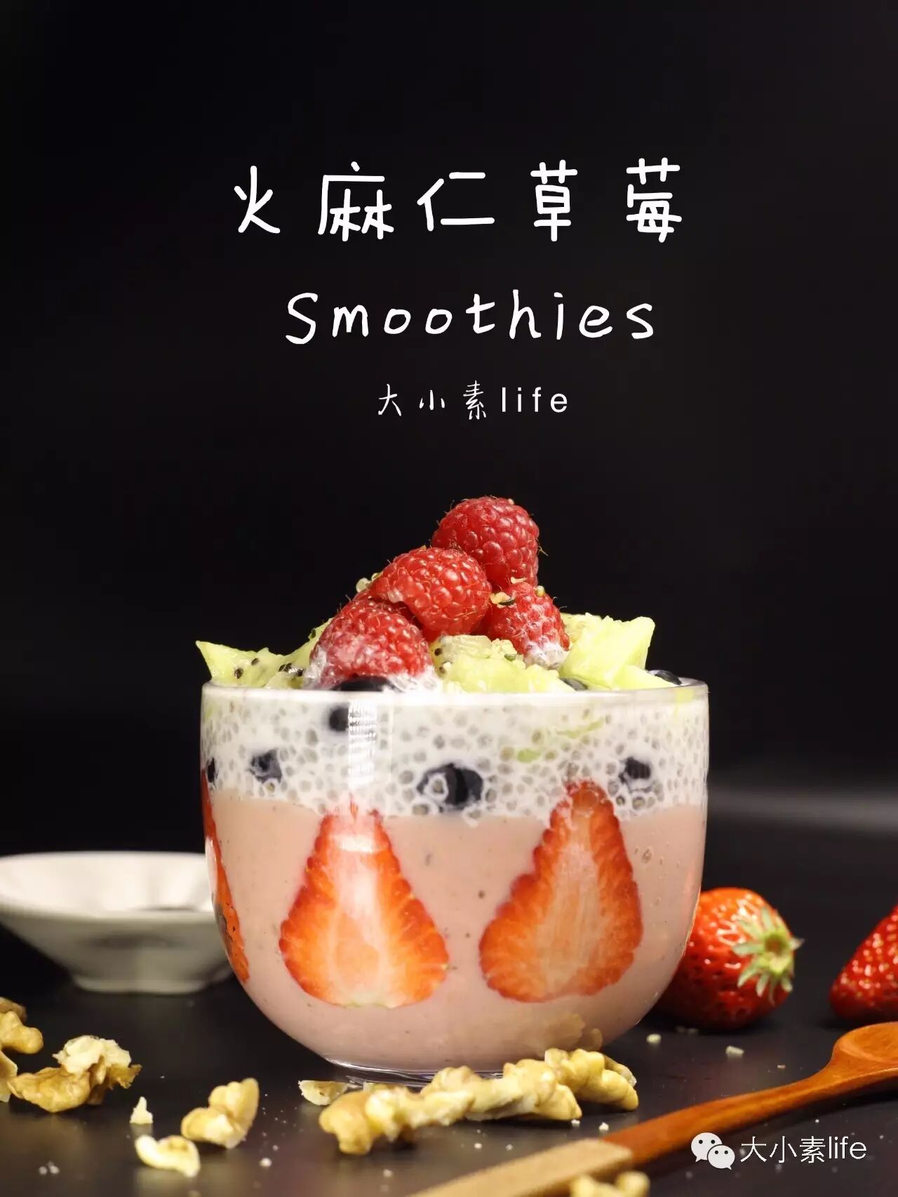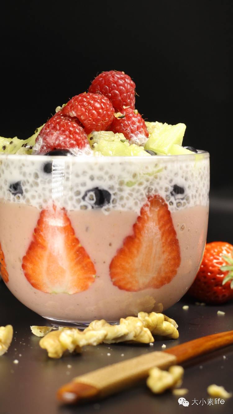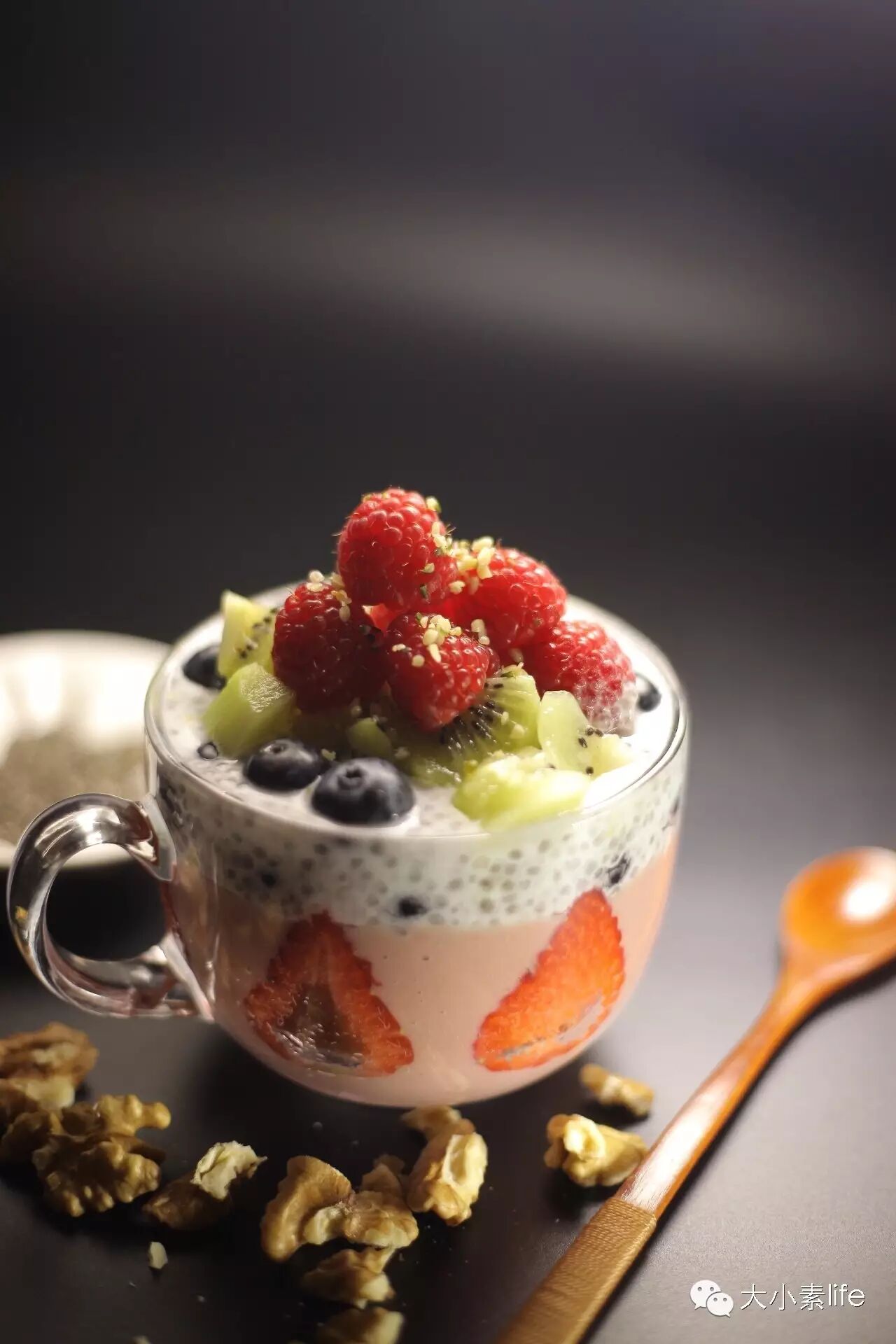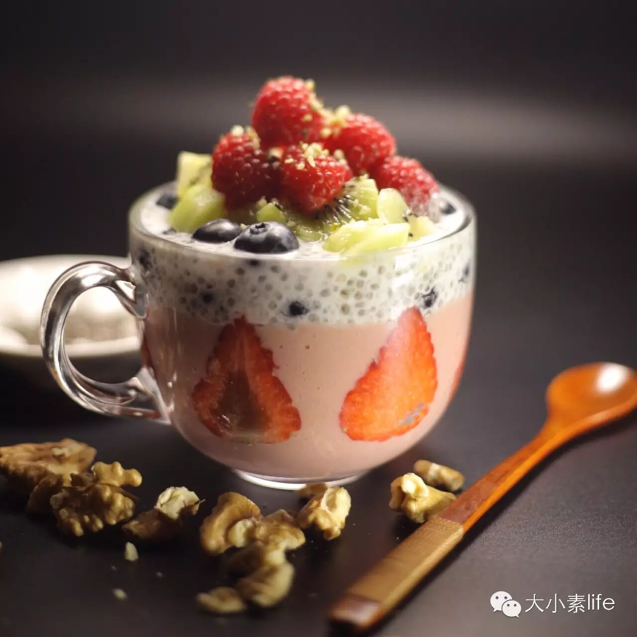 3、将奇亚籽用水泡上两个小时以上,泡发完后的奇亚籽和适量椰奶单独倒进杯子进行搅拌均匀备用。再将破壁好的果昔倒进杯子中,再淋上搅拌好的奇亚籽和椰奶,最后铺上奇异果、蓝莓、树莓、火麻仁即可,一杯美味又好喝的果昔就做好啦!