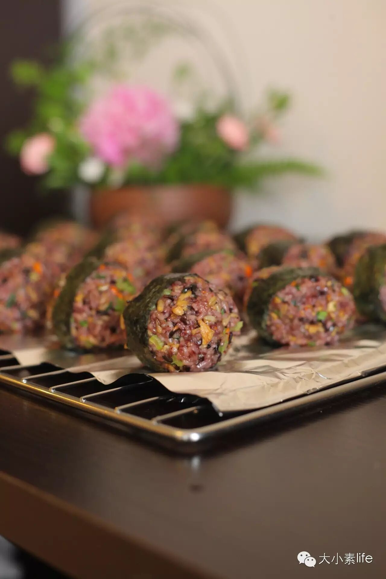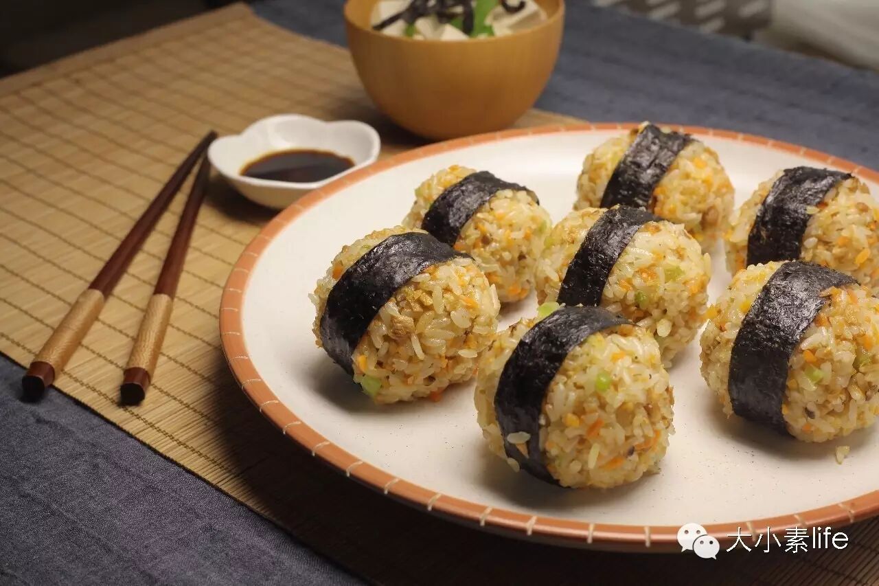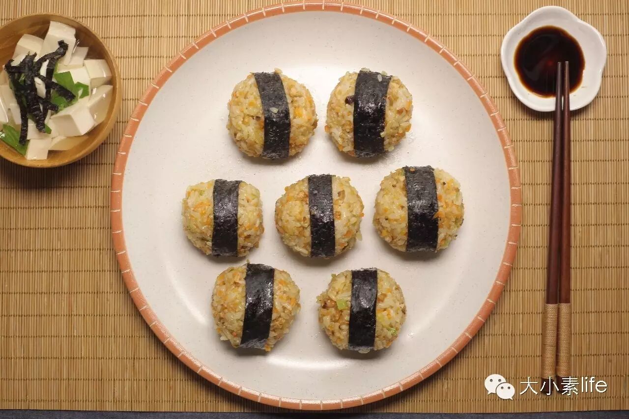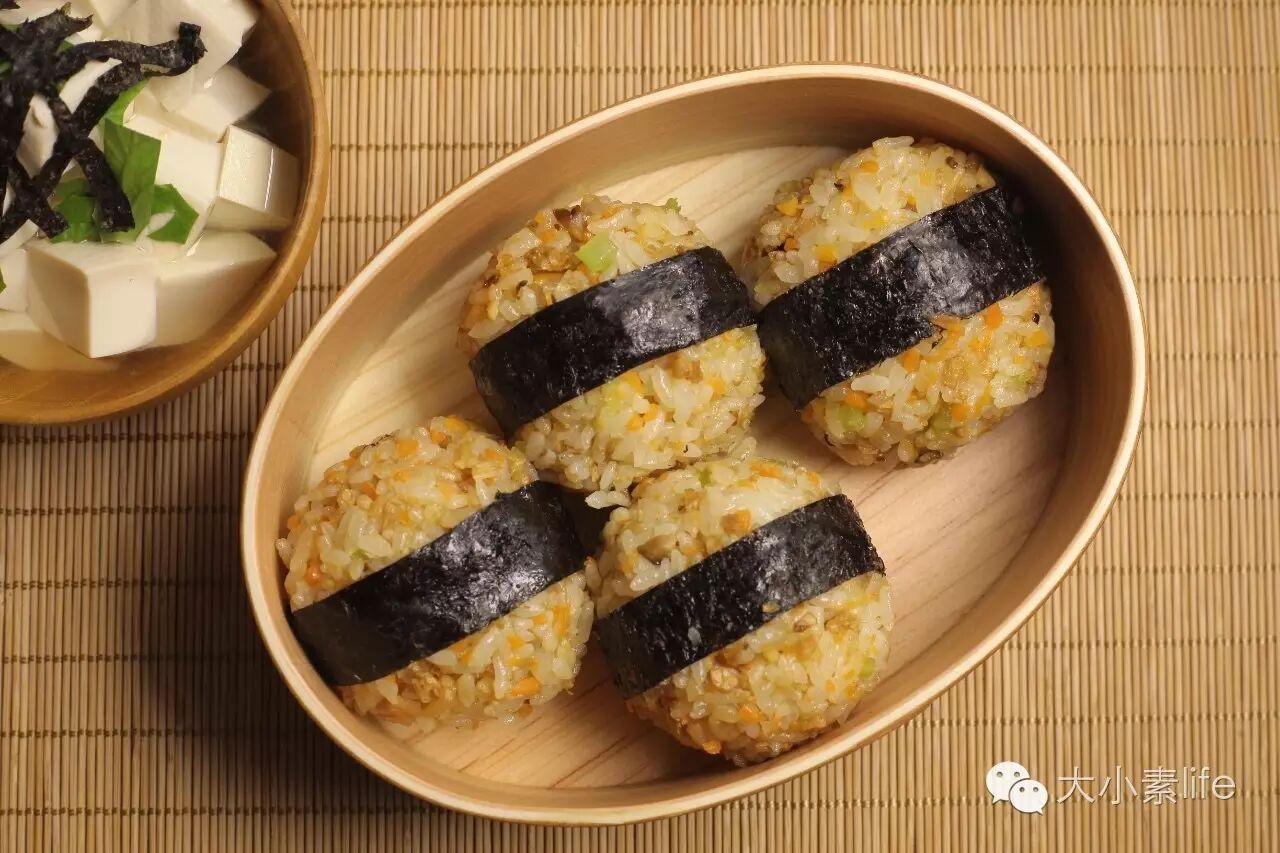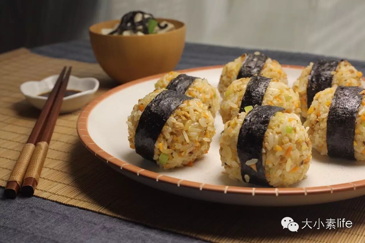 6、将海苔剪成大小适中的长条状,再将所有拌好的材料拿出一小部分粘成圆形,卷上一条海苔条就大功告成了,再配上一碗豆腐清汤就绝配了。