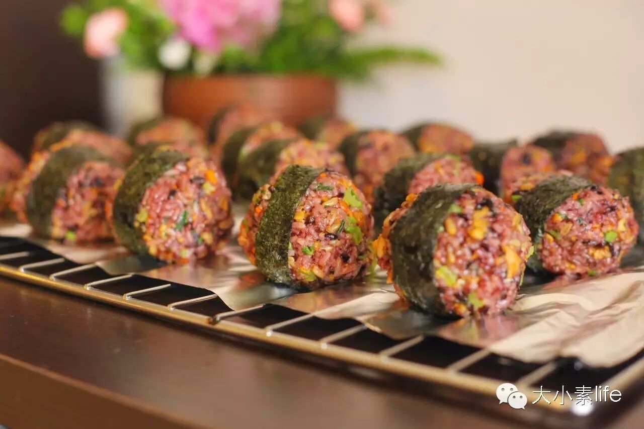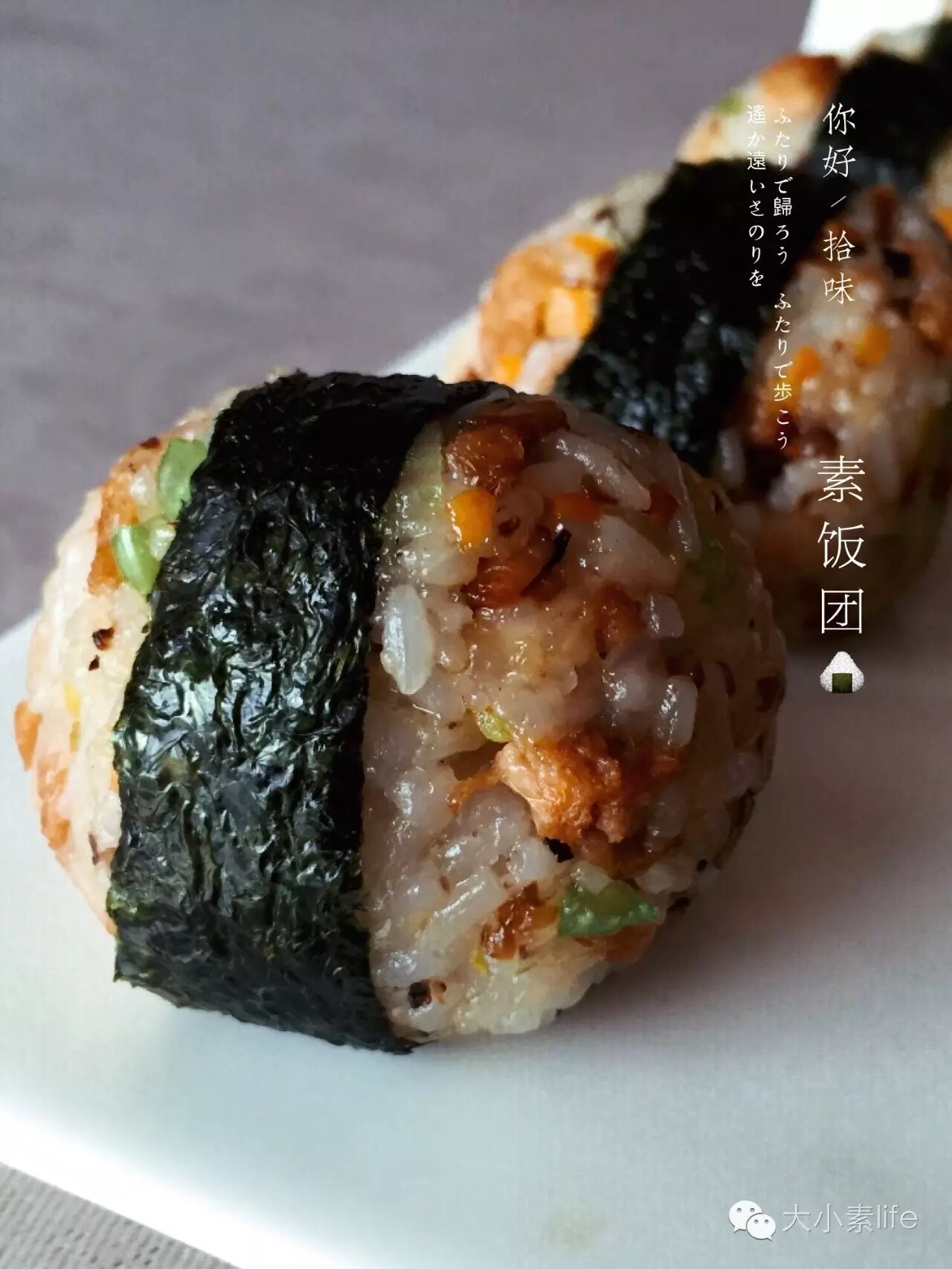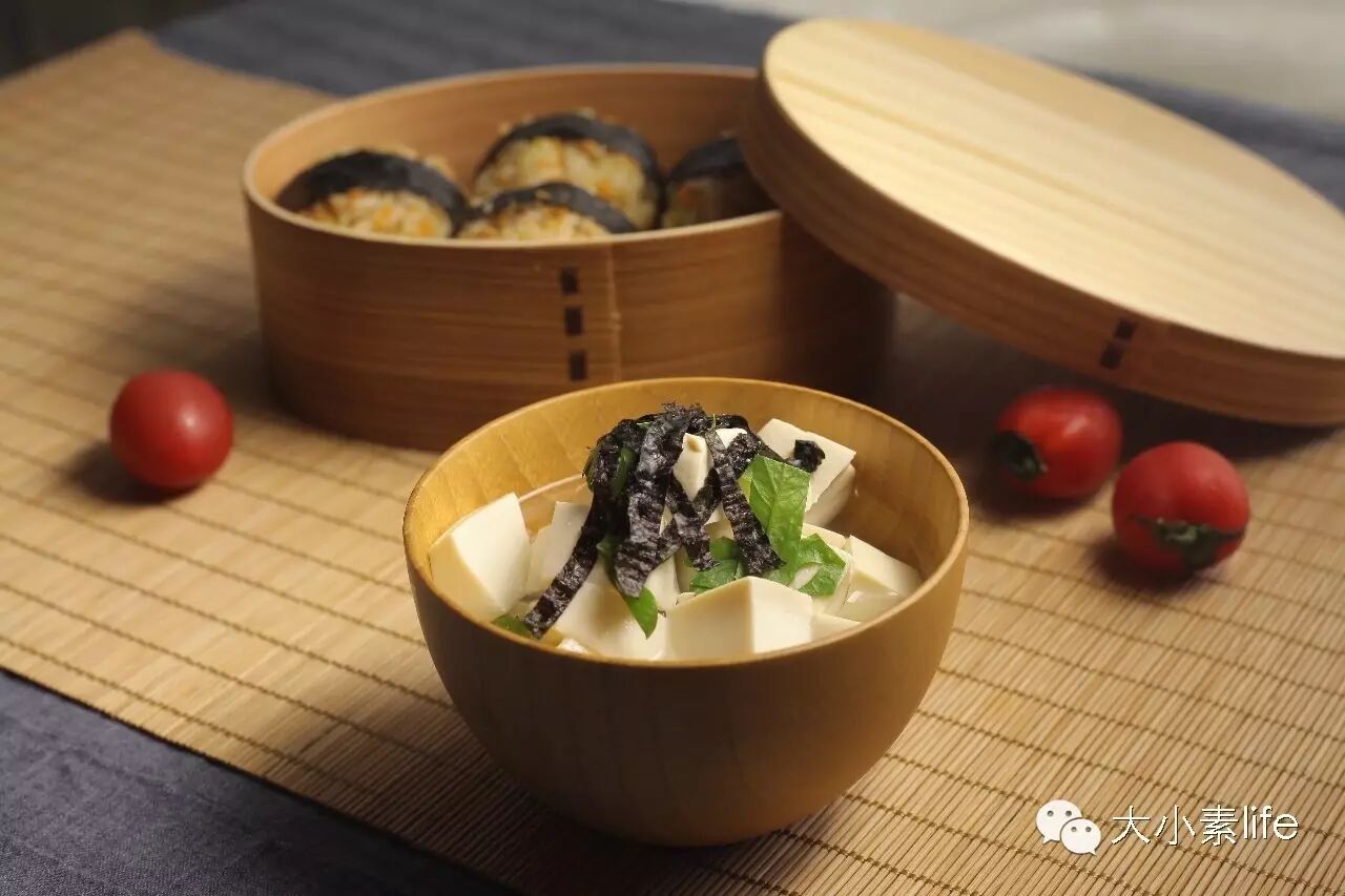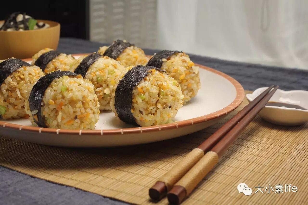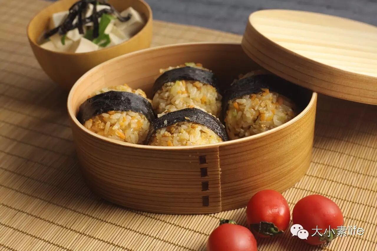 6、将海苔剪成大小适中的长条状,再将所有拌好的材料拿出一小部分粘成圆形,卷上一条海苔条就大功告成了,再配上一碗豆腐清汤就绝配了。