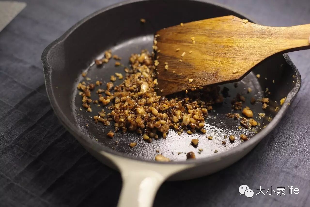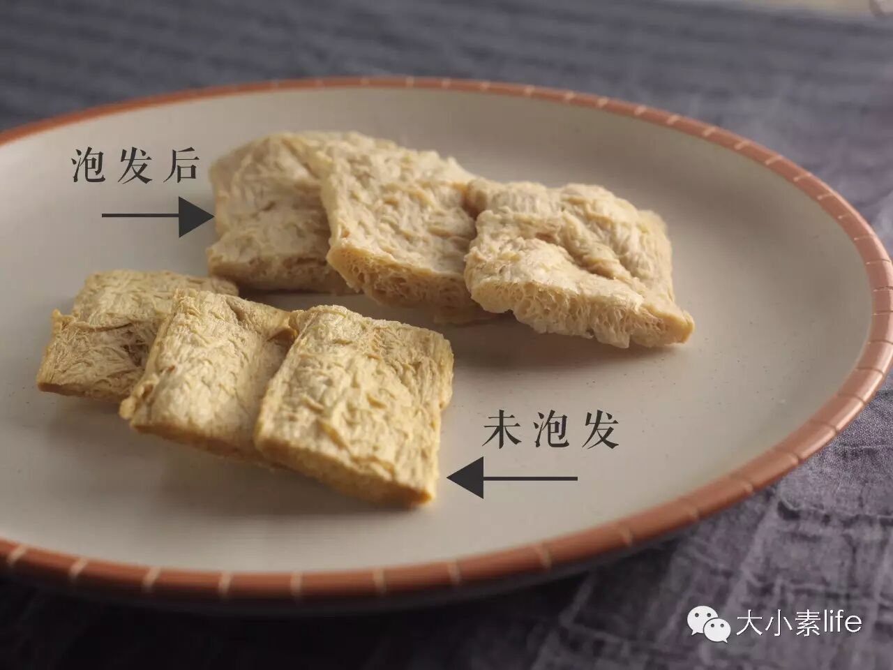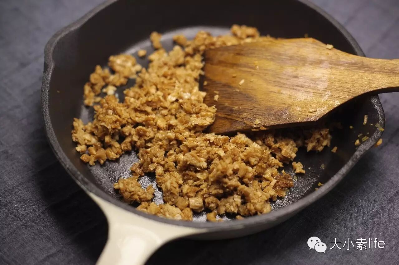 2、先将大豆蛋白片用水泡软,切碎后,热锅中火下大豆蛋白片将水分炒干,再下油翻炒,最后再转小火翻炒后下适量酱油翻炒,出锅备用;