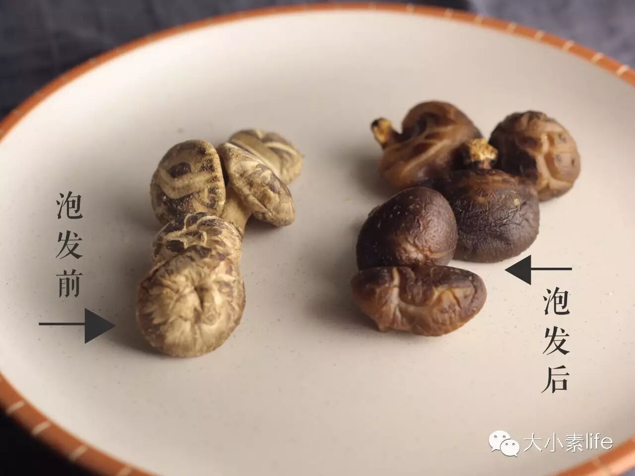 4、将香菇洗净用水泡软,切碎,热锅中火下香菇将水分炒干,再下油翻炒,最后转小火炒熟后下适量酱油,出锅备用;