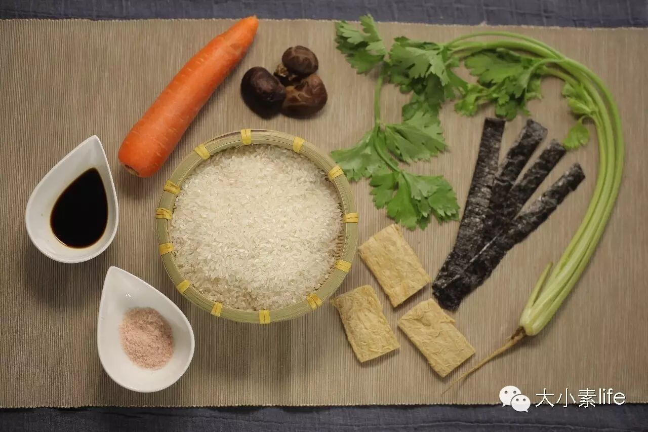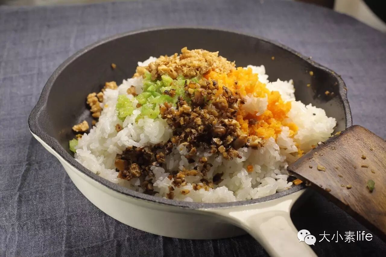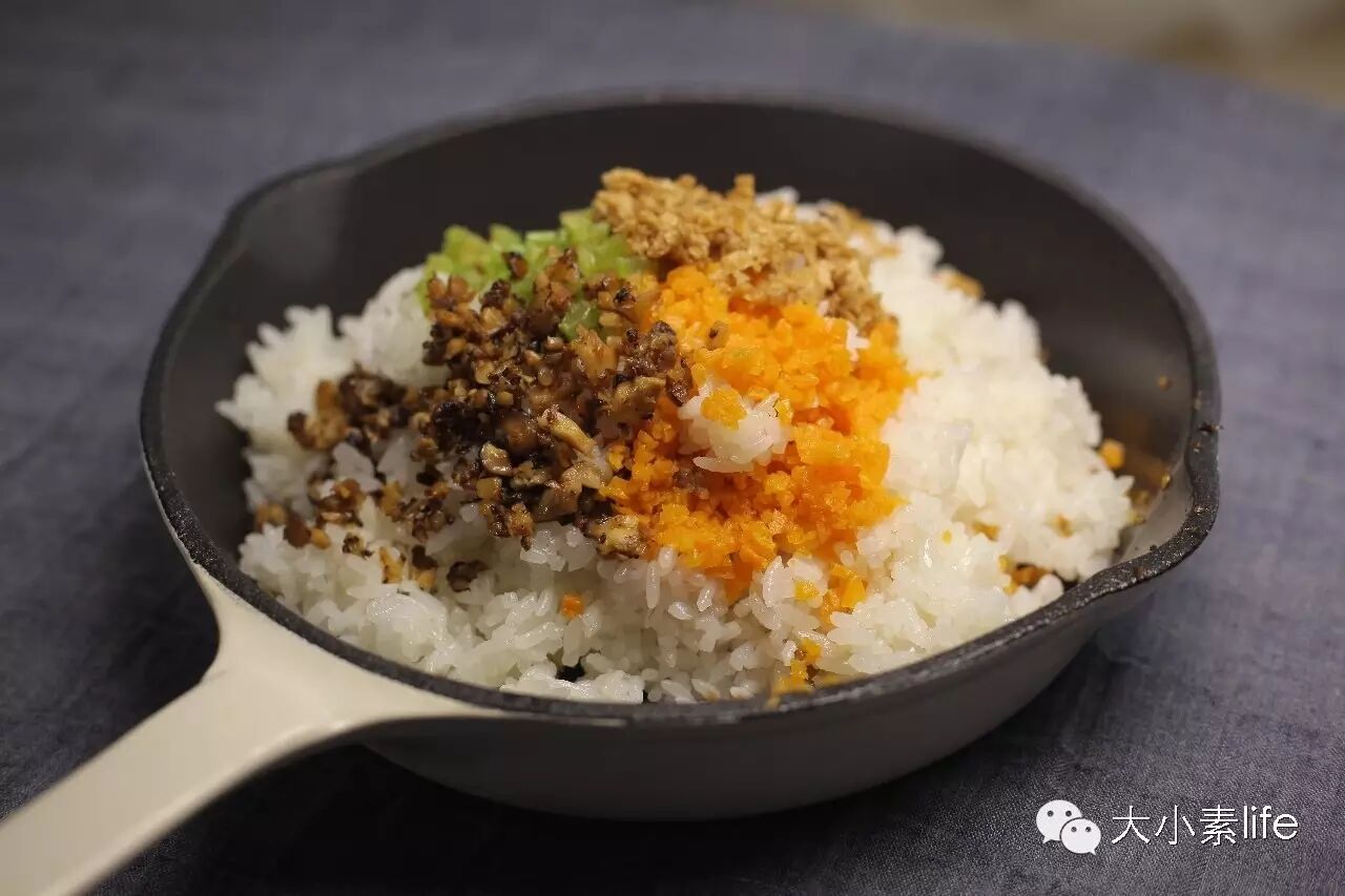 5、将芹菜洗净切细粒,和炒好的米饭、大豆蛋白片、香菇、胡萝卜一起倒进锅里搅拌均匀,备用;