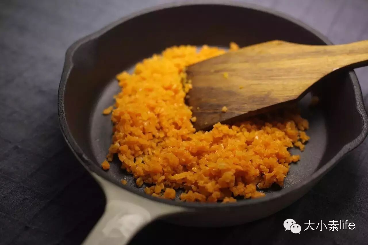 3、将胡萝卜洗净削皮,切碎,热锅下油翻炒胡萝卜,炒熟后下适量盐和酱油,出锅备用;