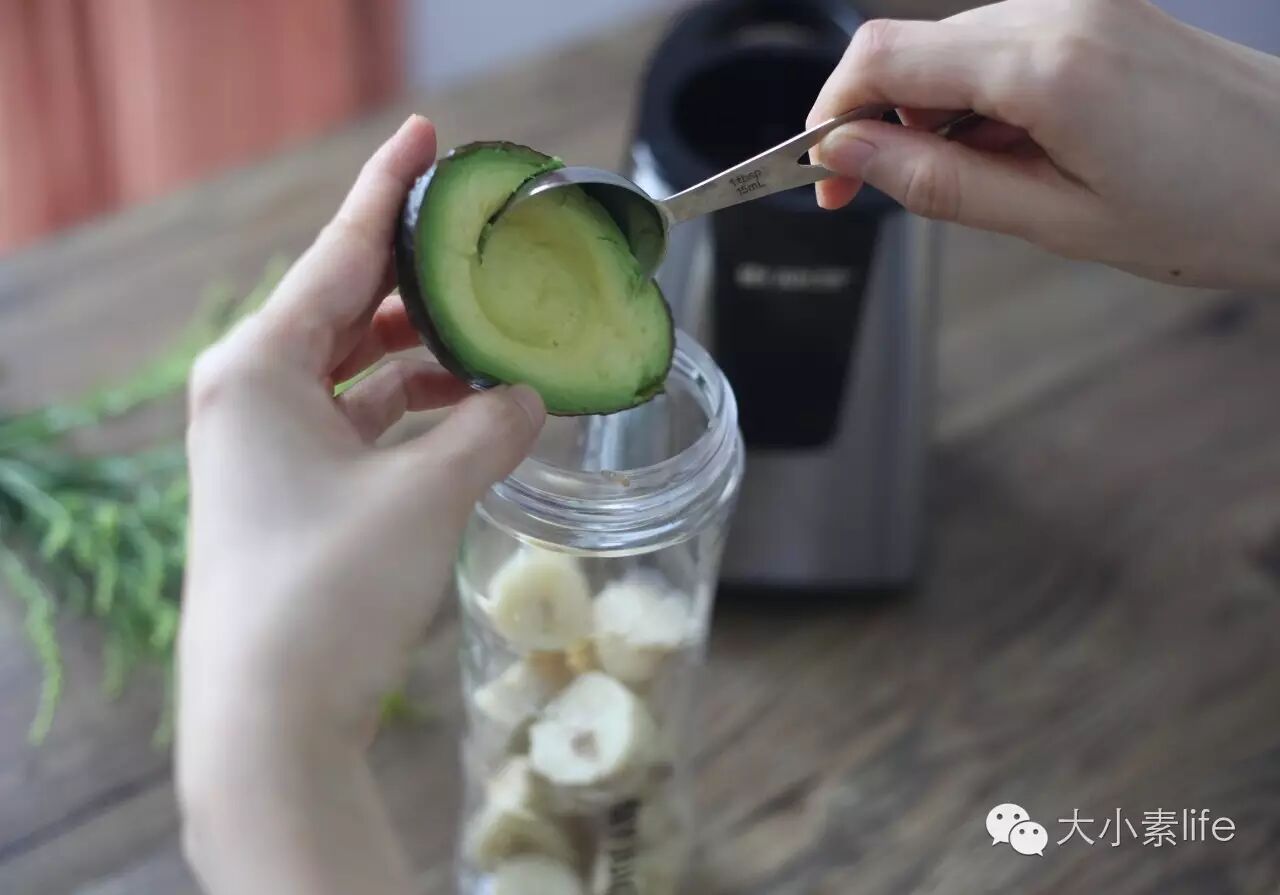 1、将新鲜的香蕉放进冰箱的急冻里,香蕉需要急冻到完全变硬状,将其去皮,切小块放进原汁机里。再将熟的牛油果切对半,拿出其中一半将果肉挖出放进原汁机里,备用;(PS:便利装“Ergo chef原汁机”在大小素微店有售。)