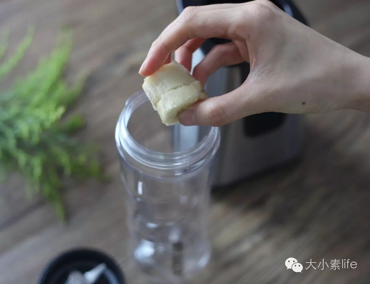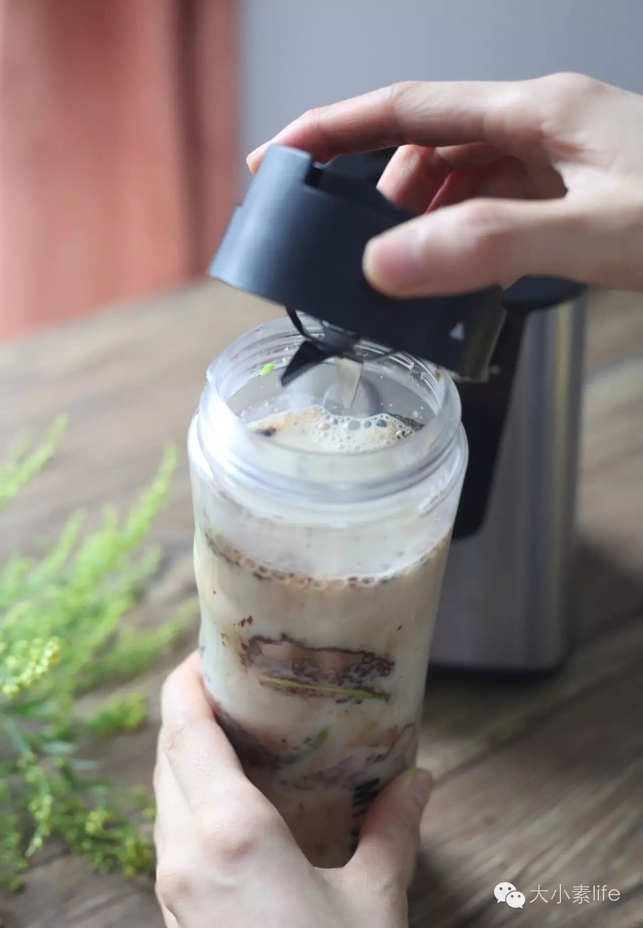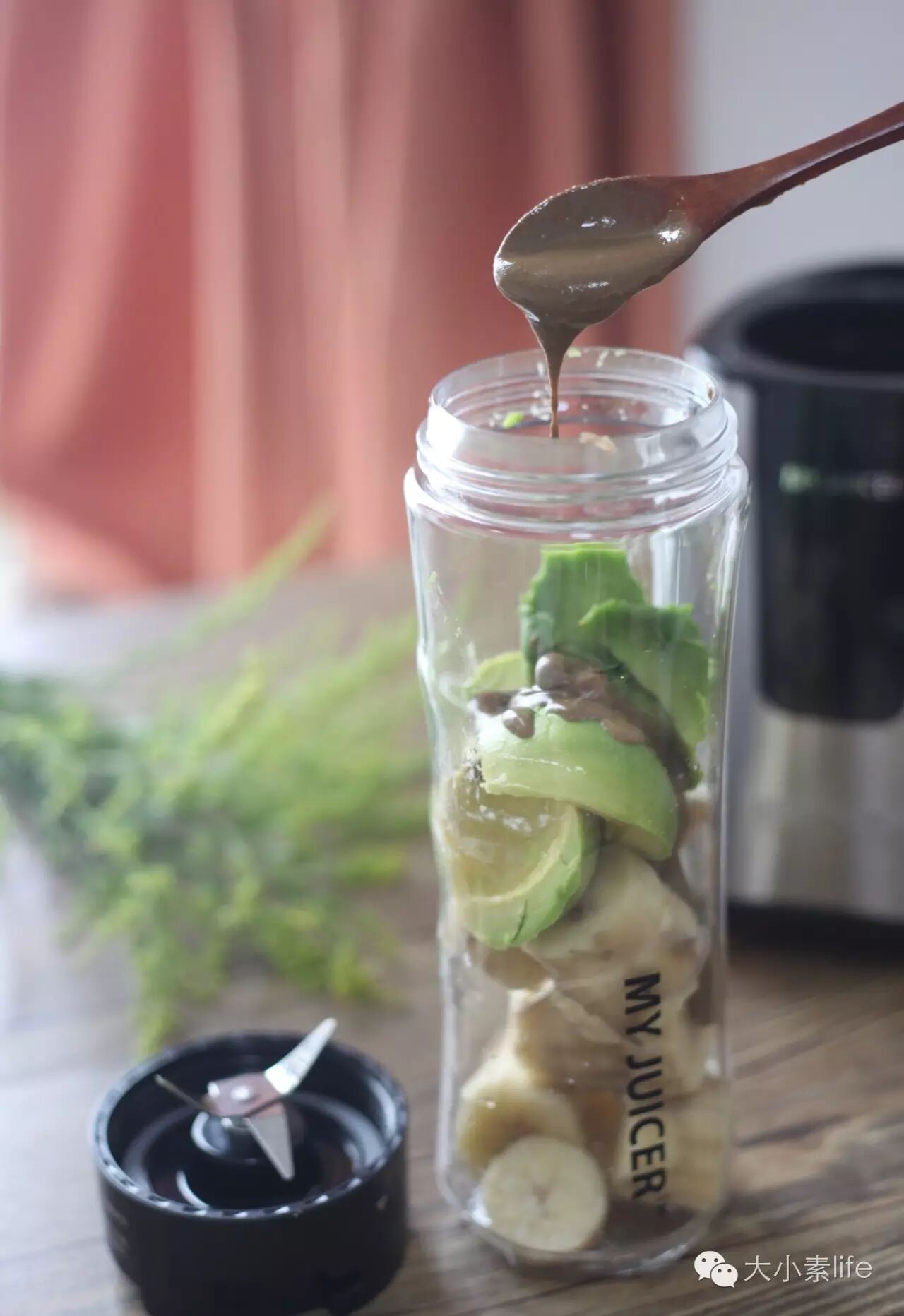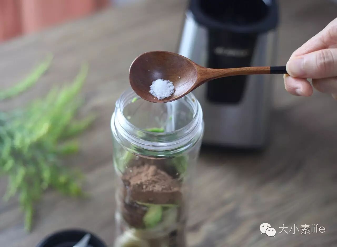 3、将可可粉、白芝麻酱、盐放进原汁机,放好后,盖上原汁机盖子进行破壁至细腻即可。(PS:有机印尼可可粉、白芝麻酱、喜马拉雅山岩盐在大小素微店有售。)
