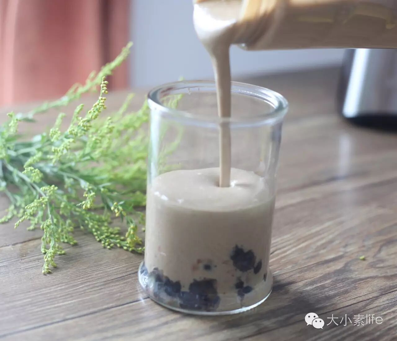 2、将豆浆粉用热水冲好,搅拌均匀后,需放凉,再将凉豆浆倒进原汁机里,备用;