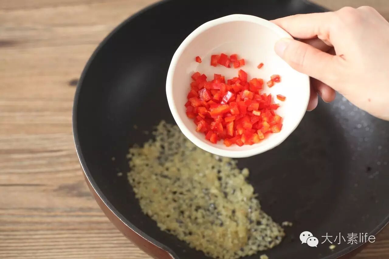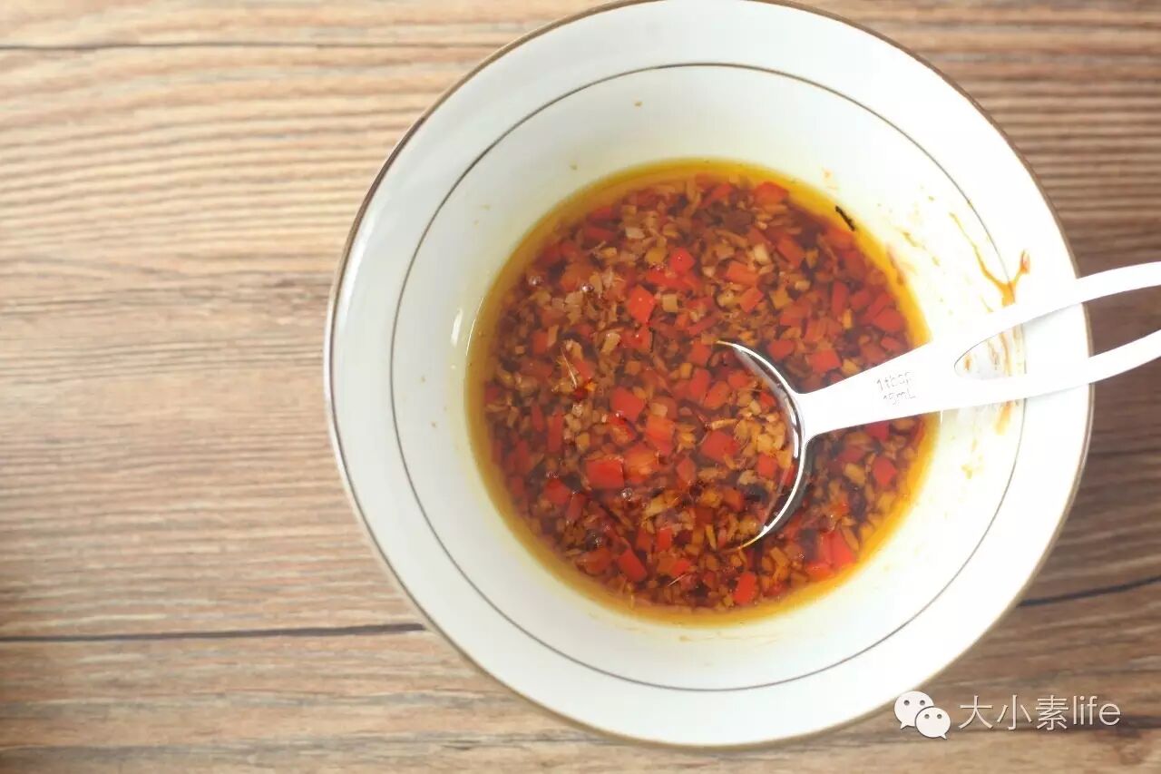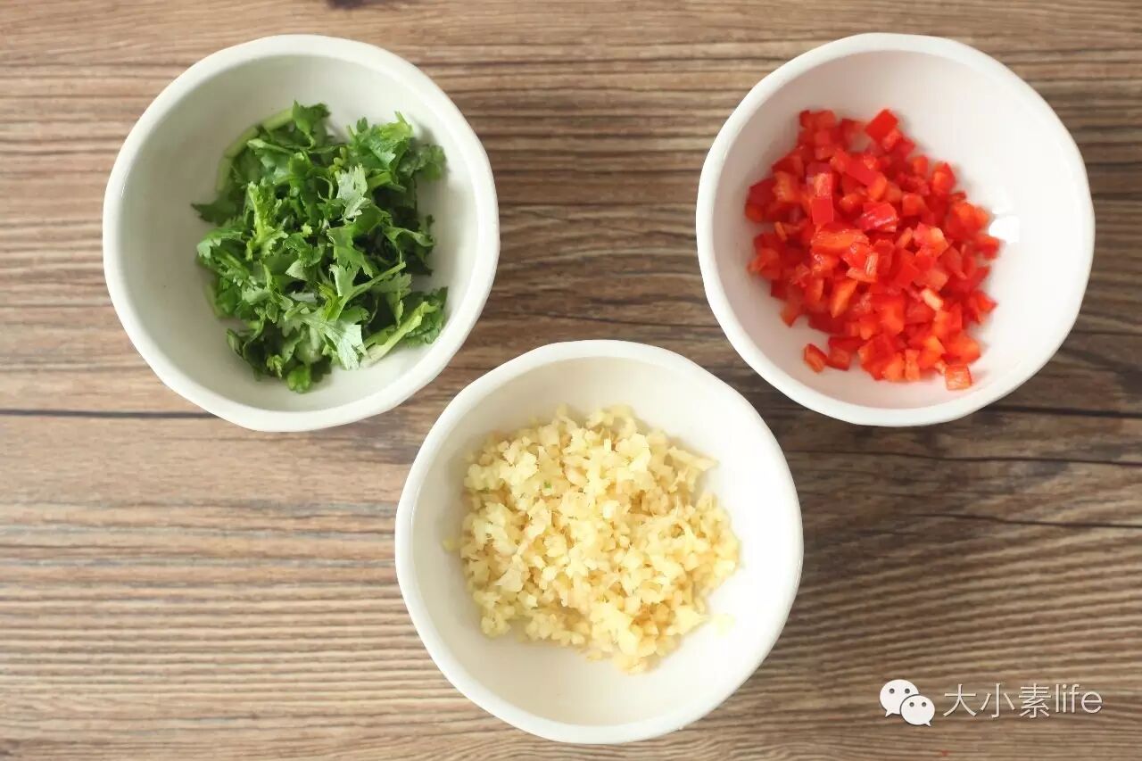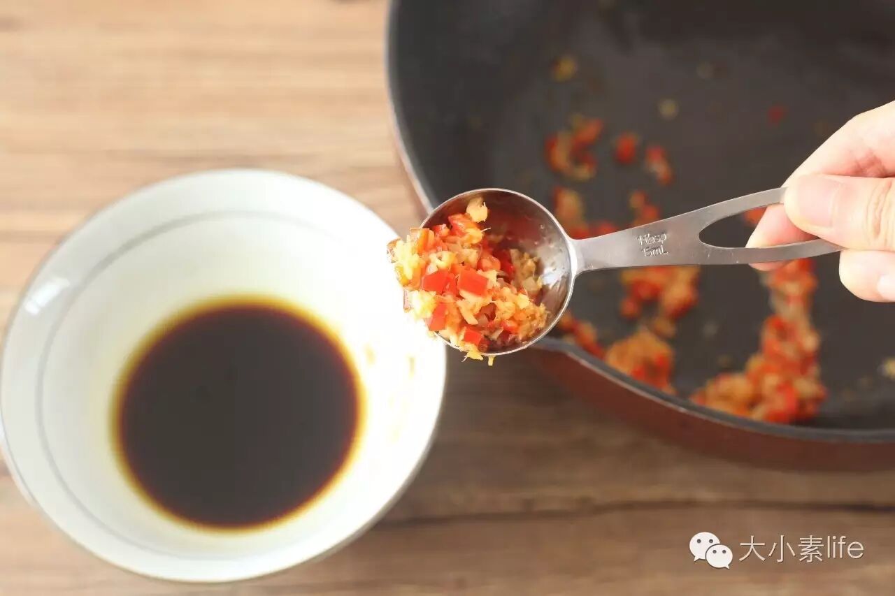 3、将生姜、香菜、红椒洗净切碎粒状,生姜与红椒用油爆炒至香后盛进调好的酱料中搅拌均匀,备用;