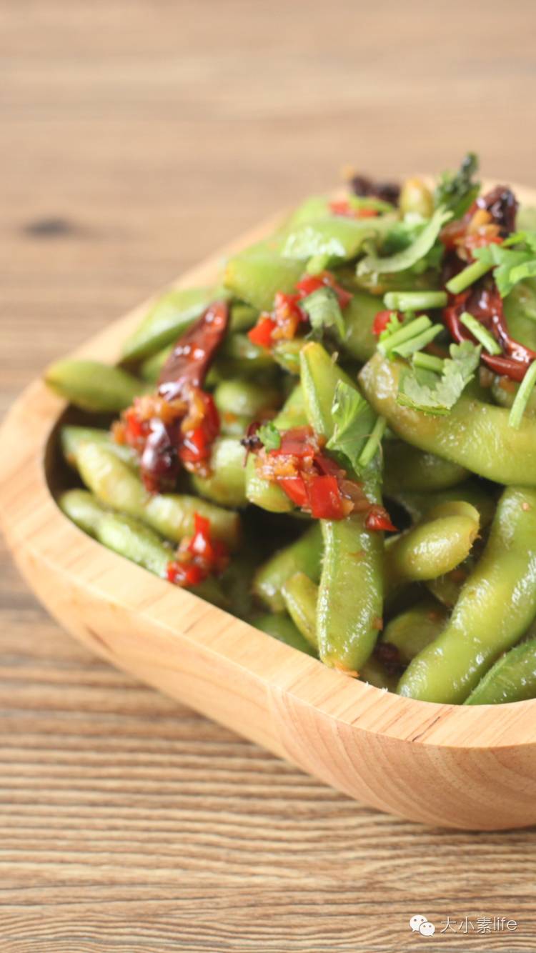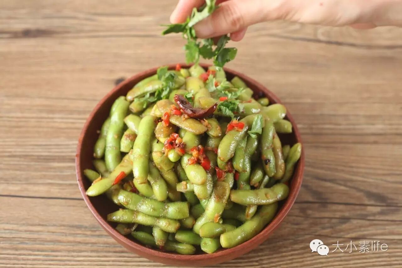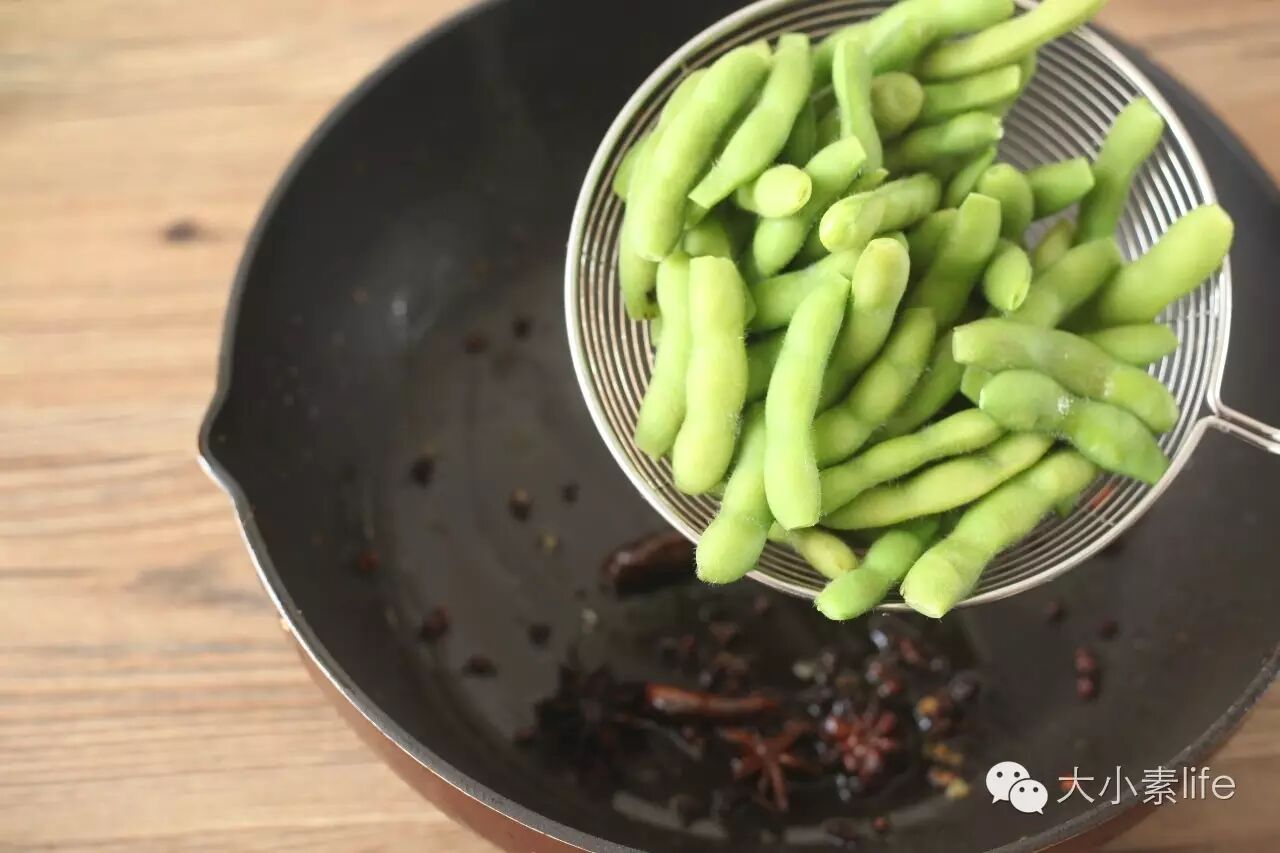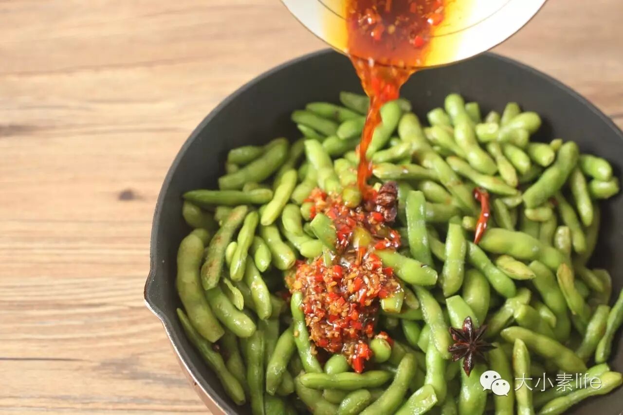 4、将油倒进锅里,热油后,放进八角、干辣椒、花椒籽爆炒至有香味后,再放进煮好的毛豆翻炒一会,再将调好的酱料倒进锅里,盖上锅盖进行焖煮至收干汁即可出锅,最后撒上香菜即可享用。(PS:炒好的毛豆壳是不能吃的哦~)
