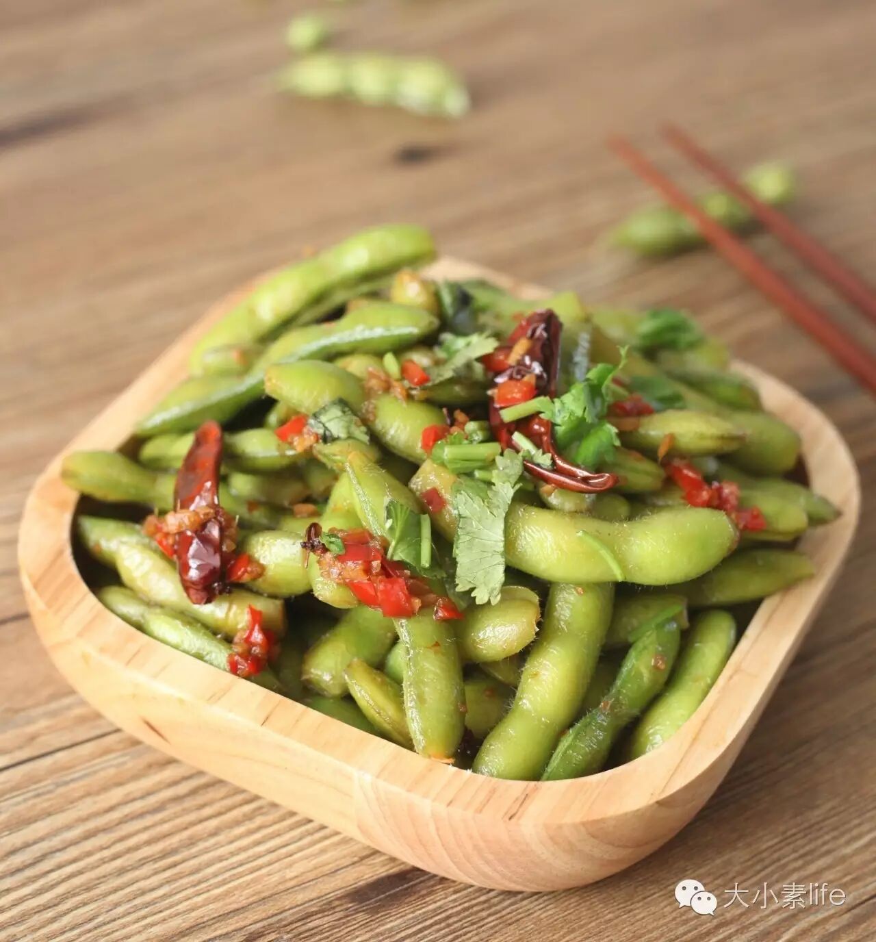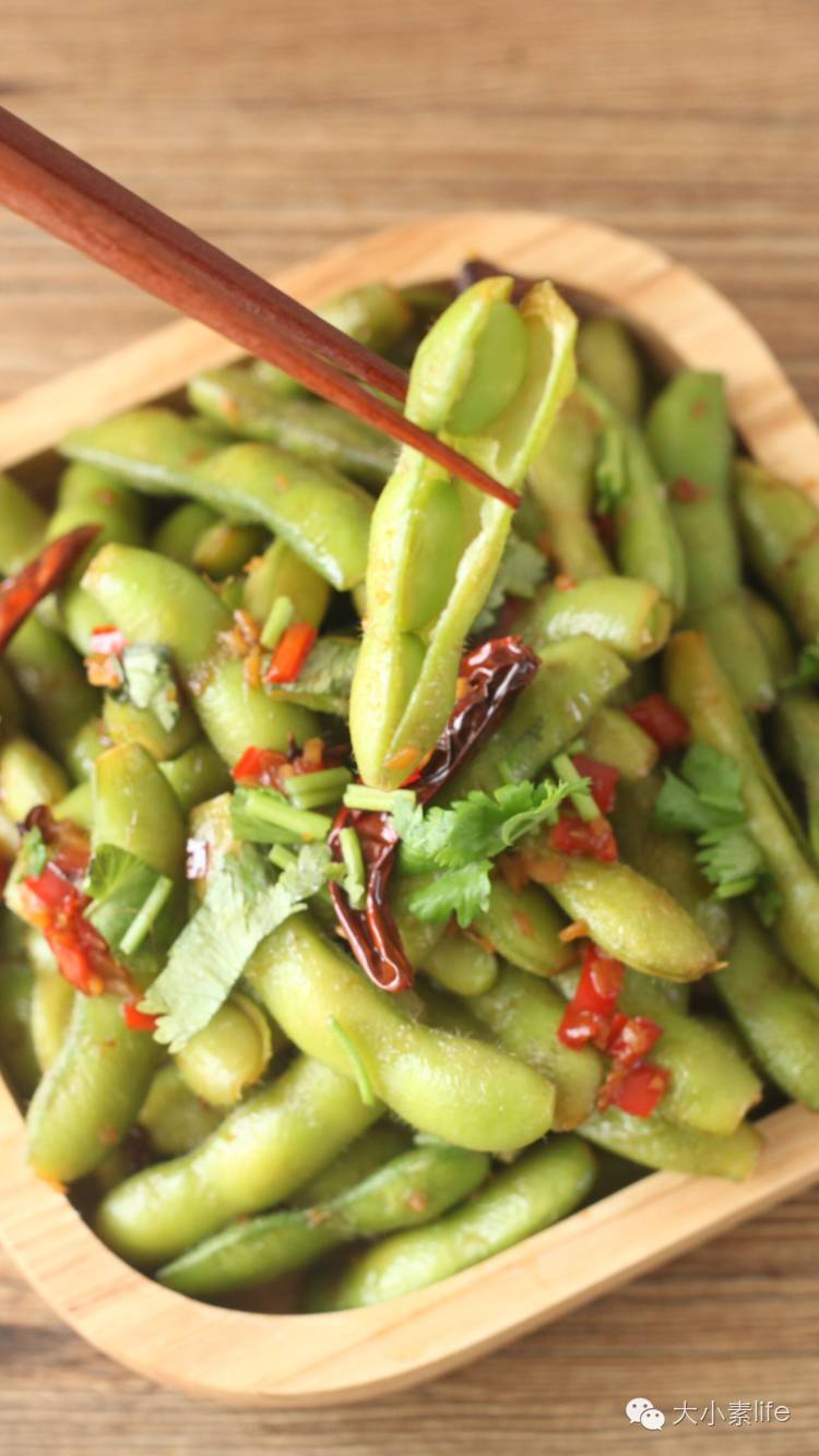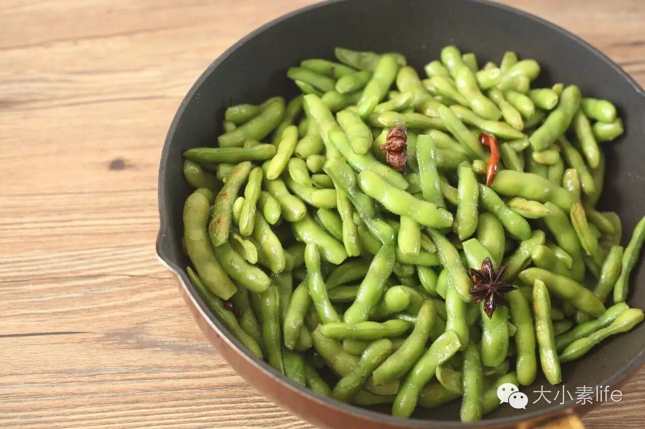 4、将油倒进锅里,热油后,放进八角、干辣椒、花椒籽爆炒至有香味后,再放进煮好的毛豆翻炒一会,再将调好的酱料倒进锅里,盖上锅盖进行焖煮至收干汁即可出锅,最后撒上香菜即可享用。(PS:炒好的毛豆壳是不能吃的哦~)