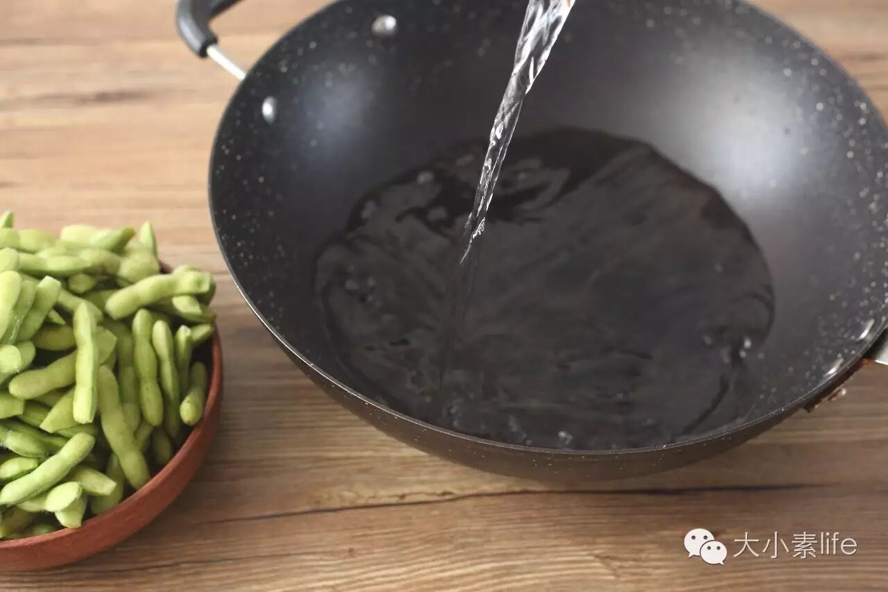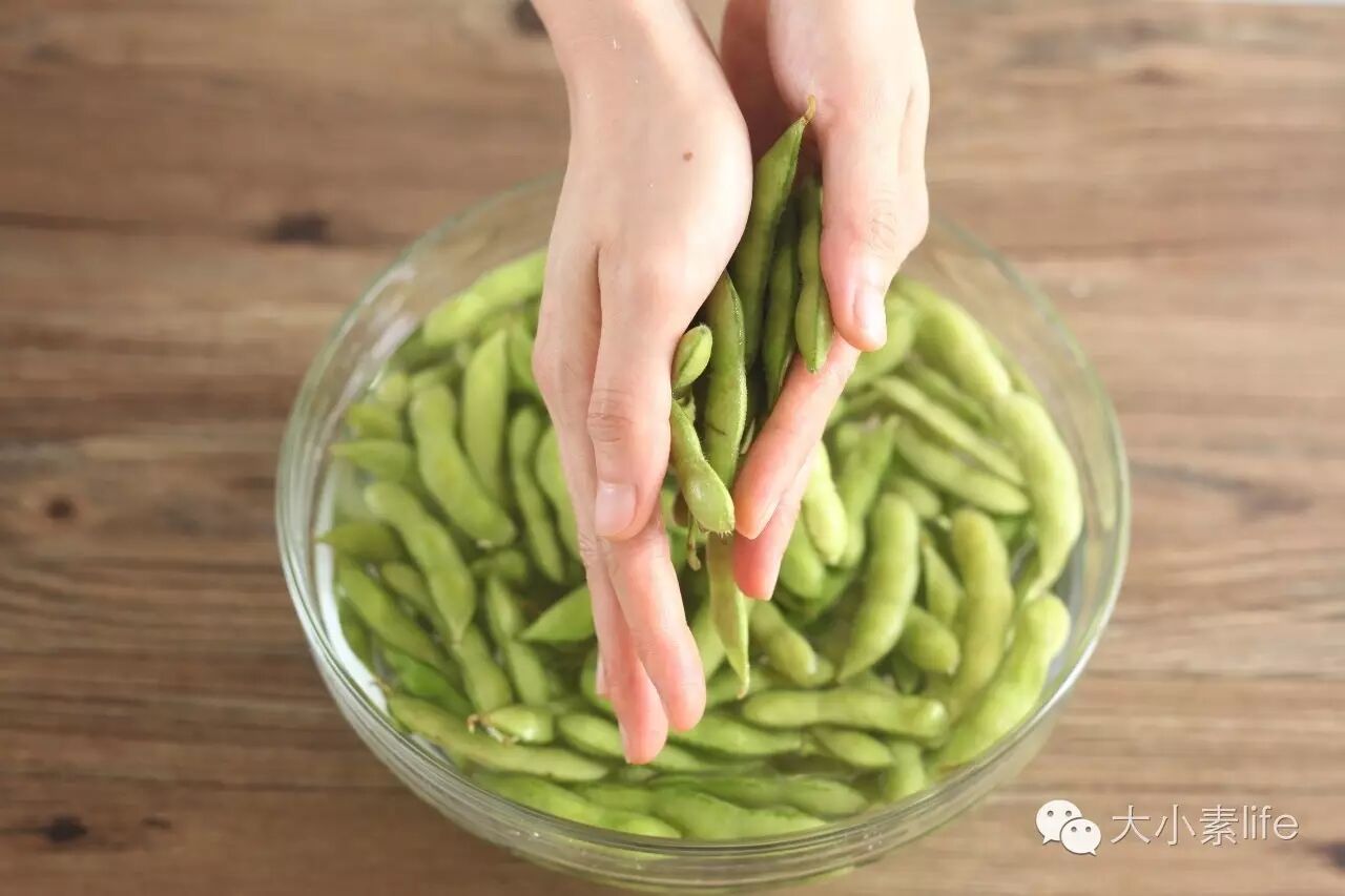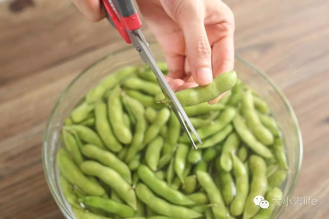 1、将毛豆放在过滤水中用双手来回的搓洗,去掉脏东西,洗净后,将每一颗毛豆的两头用剪刀剪掉。在锅里倒进适量的过滤水煮开,将剪好的毛豆倒进锅里煮熟(ps:可捞出一颗毛豆试试是否熟了),煮熟后沥水,备用;