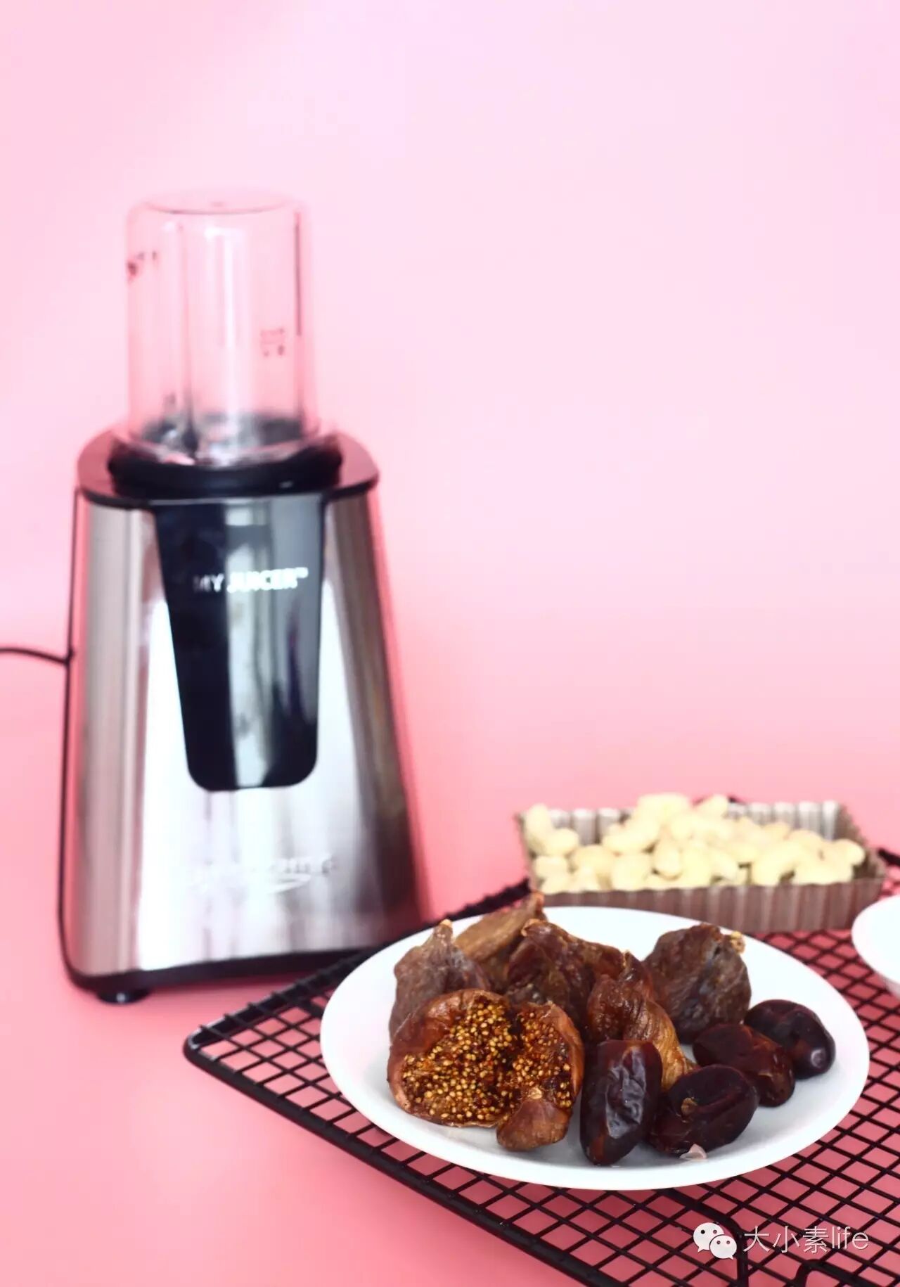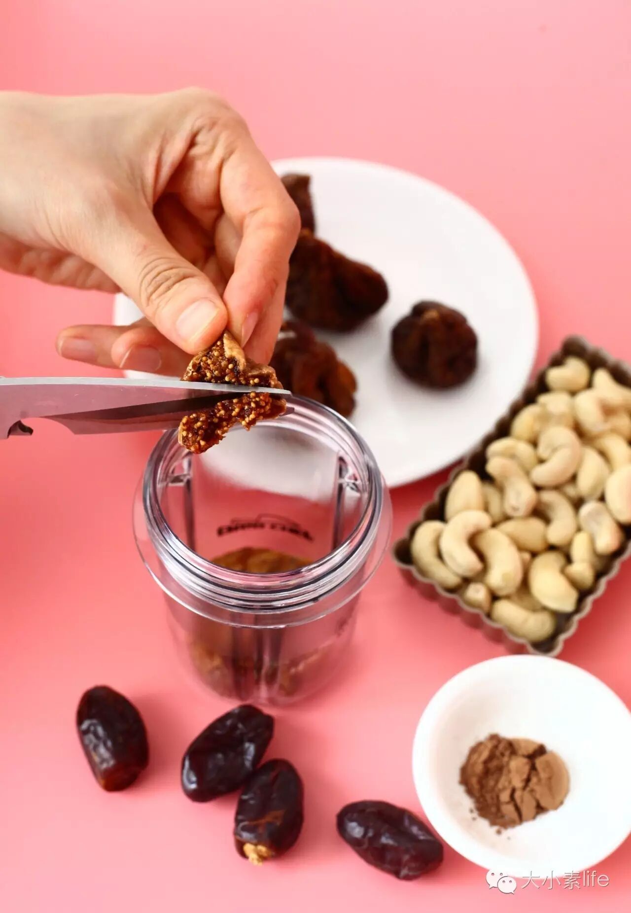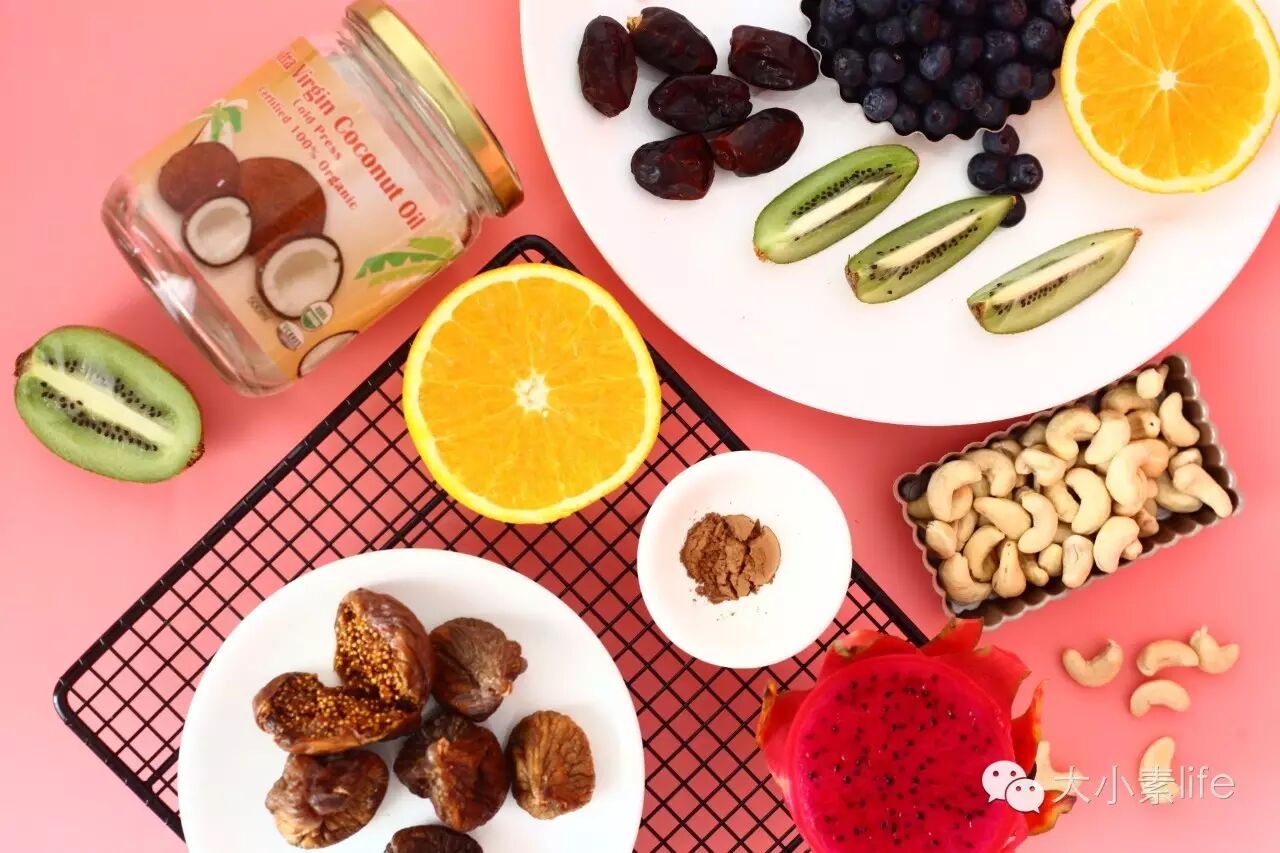 1、将生腰果洗净,用过滤水泡两个小时后沥干,再将椰枣去壳剪成小颗粒状,无花果剪成小颗粒状,接着将泡好的生腰果、椰枣、无花果、可可粉、椰子油放进磨研机破壁打碎(无需打成泥状),倒出,备用;(PS:磨研机、有机椰子油在“大小素”微店有售。)