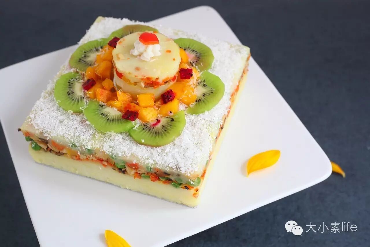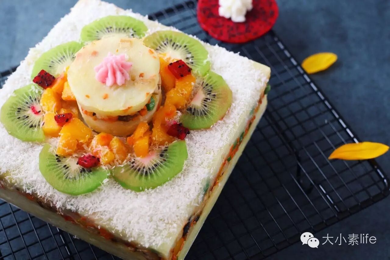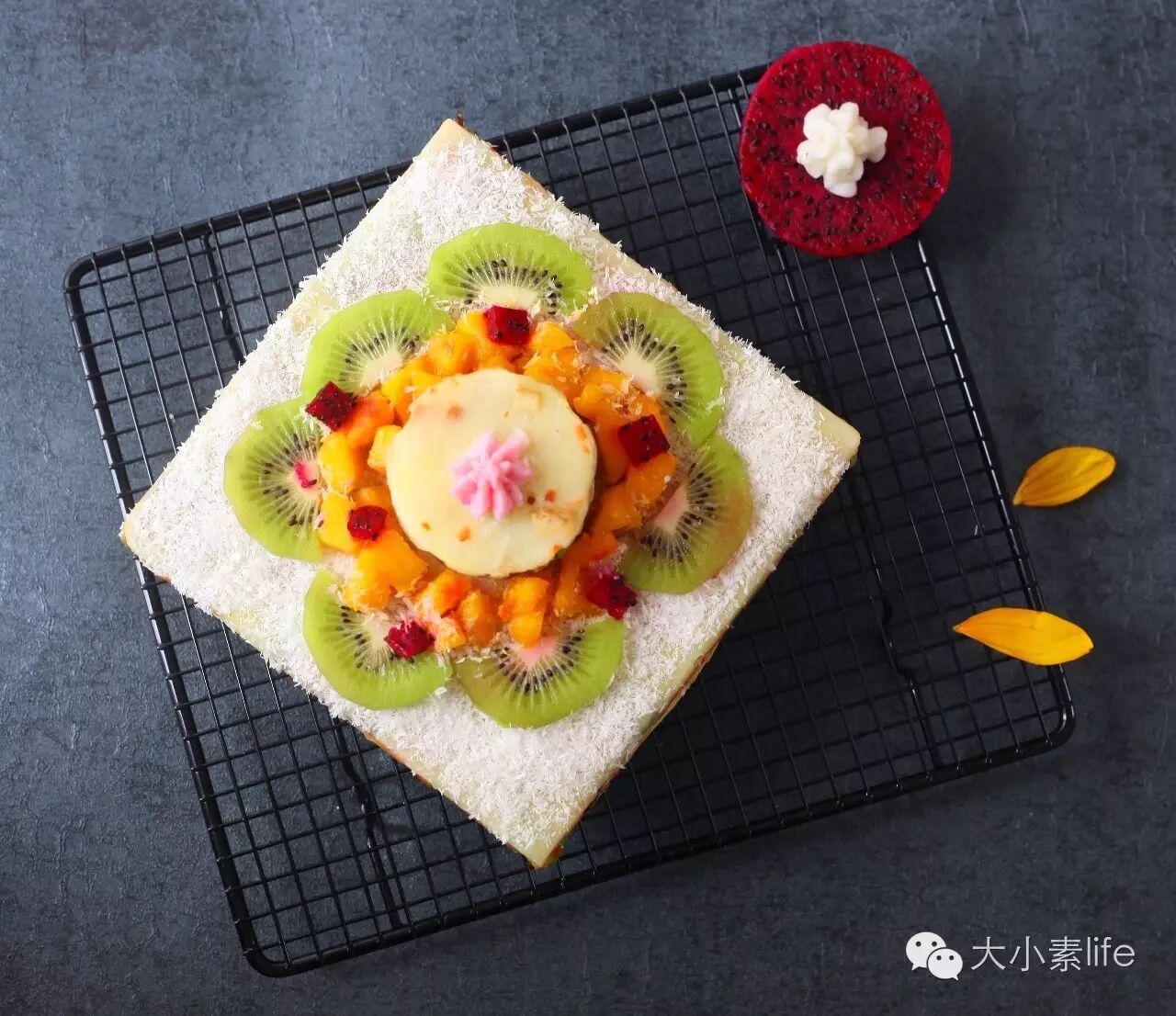 7、脱模后,将椰蓉轻散在诞糕面上,再将奇异果切片、芒果、火龙果切粒依次在诞糕上进行装饰,您也可以根据自己喜欢的蔬果进行造型,充分发挥您的创造力吧。