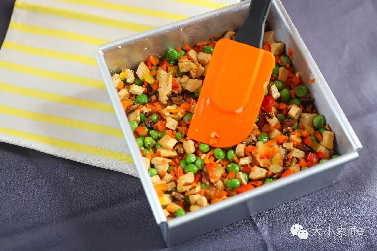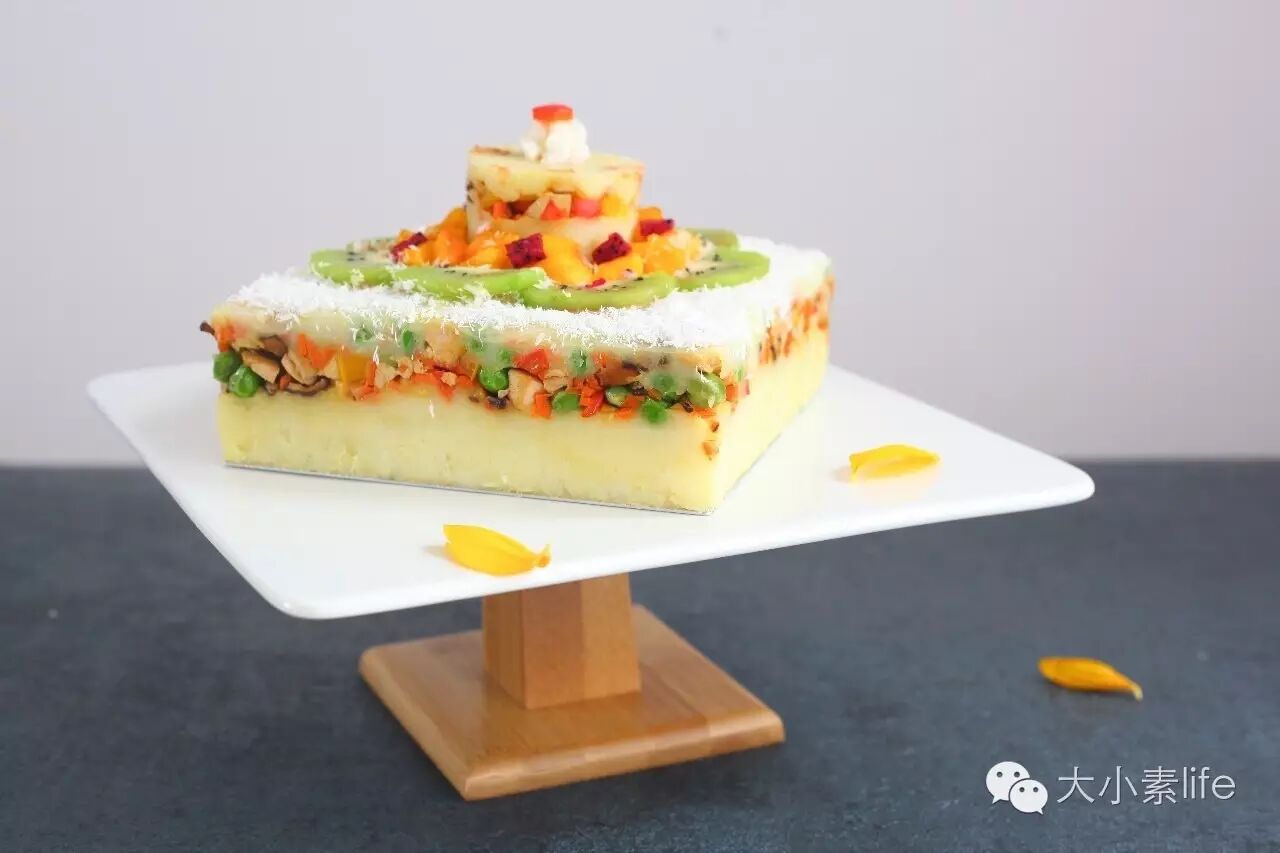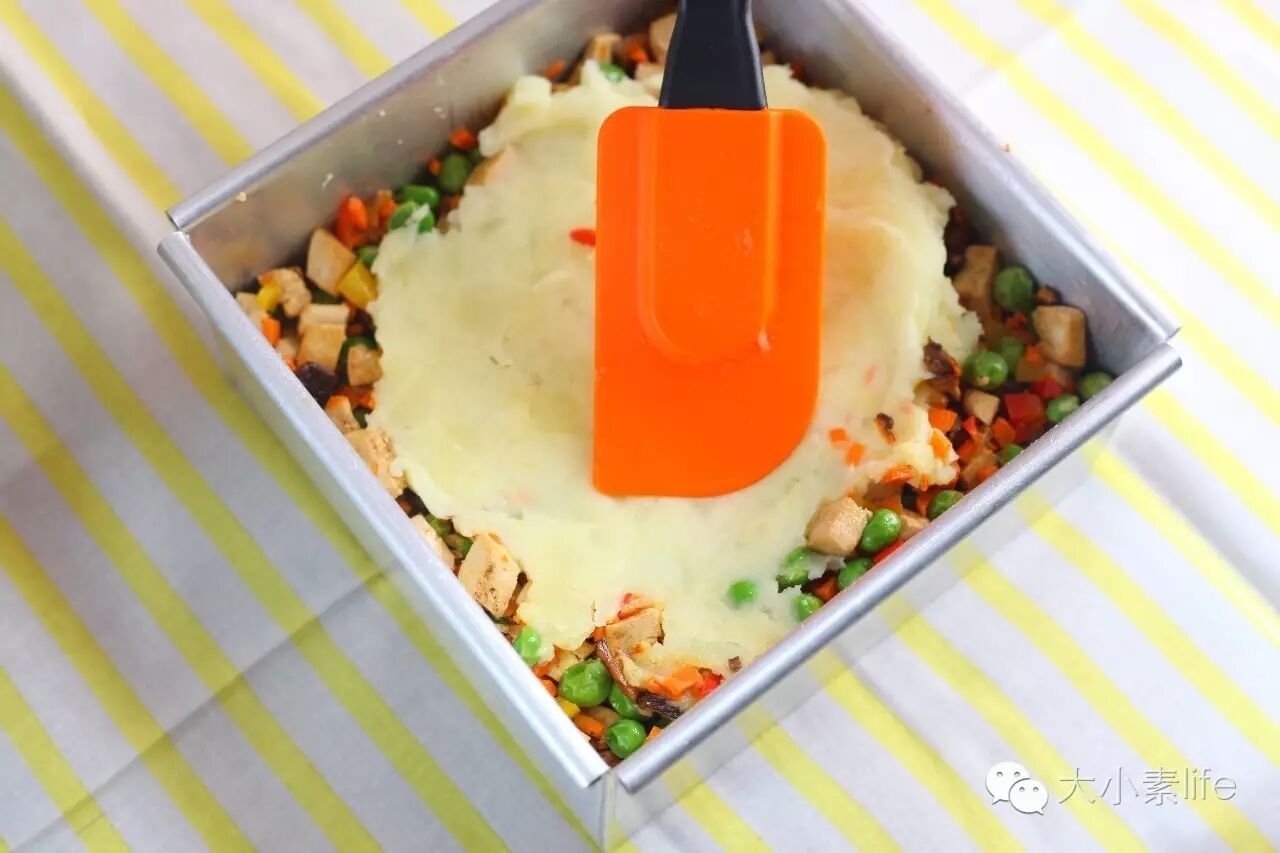 6、用8寸诞糕模具最底部铺上一层600g的土豆泥,压紧压平后再将搅拌好的炒料放在土豆泥上面,压紧压平,最后再铺上一层400g的土豆泥,压紧压平,静置一个小时即可脱模。(温馨小提示:如果想要快些品尝,可用200度预热烤箱10分钟后,将其放进烤箱用200度烤5-10分钟拿出晾凉,脱模。)