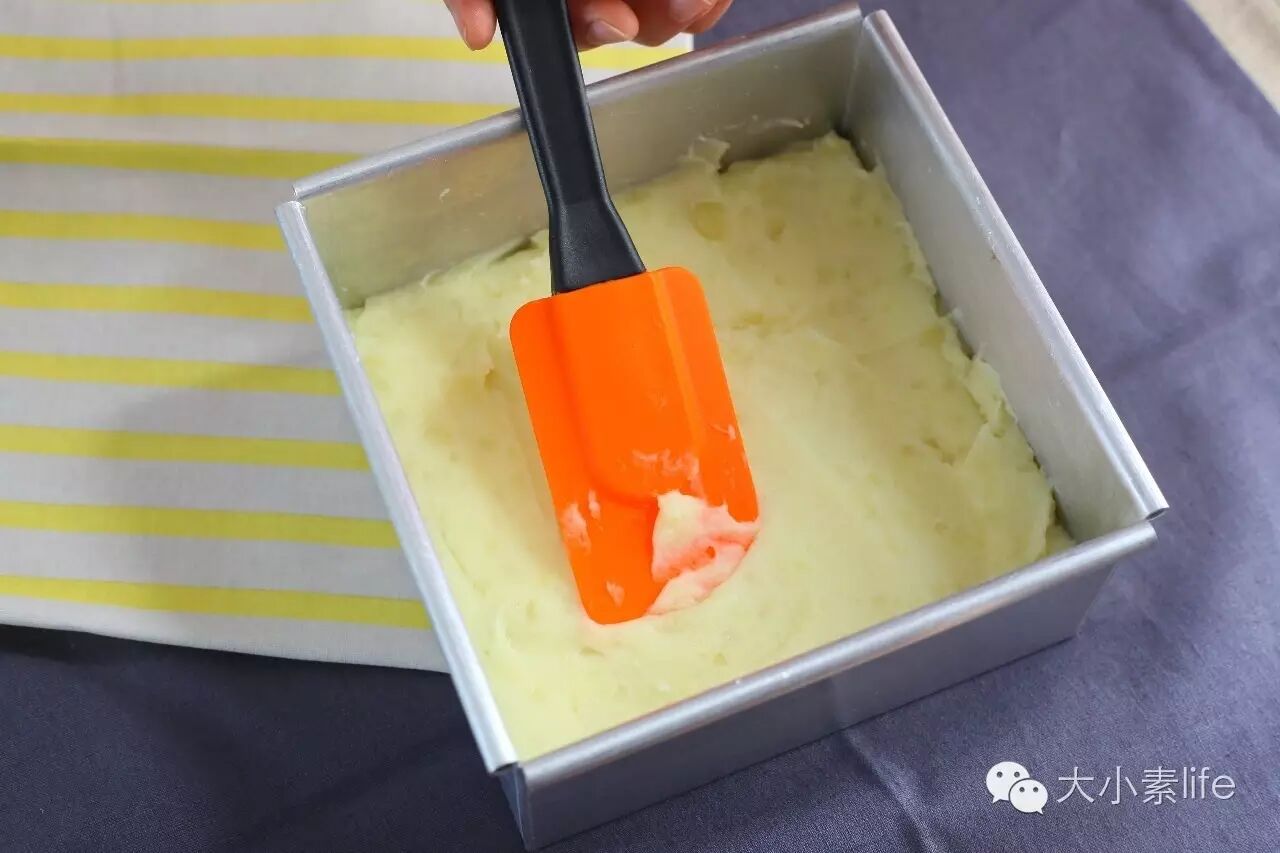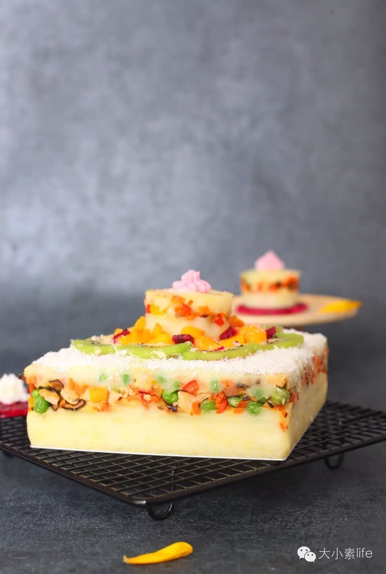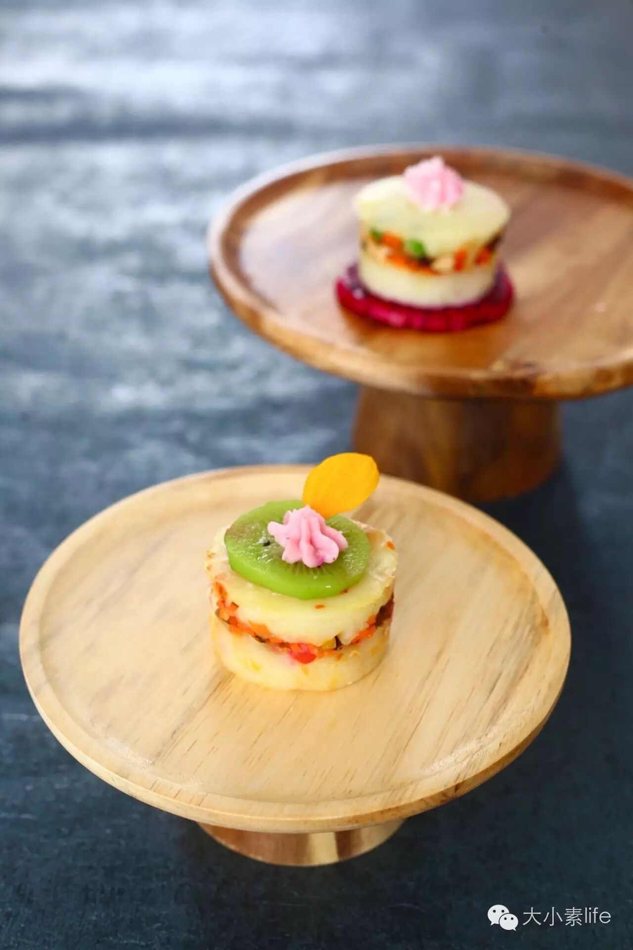6、用8寸诞糕模具最底部铺上一层600g的土豆泥,压紧压平后再将搅拌好的炒料放在土豆泥上面,压紧压平,最后再铺上一层400g的土豆泥,压紧压平,静置一个小时即可脱模。(温馨小提示:如果想要快些品尝,可用200度预热烤箱10分钟后,将其放进烤箱用200度烤5-10分钟拿出晾凉,脱模。)