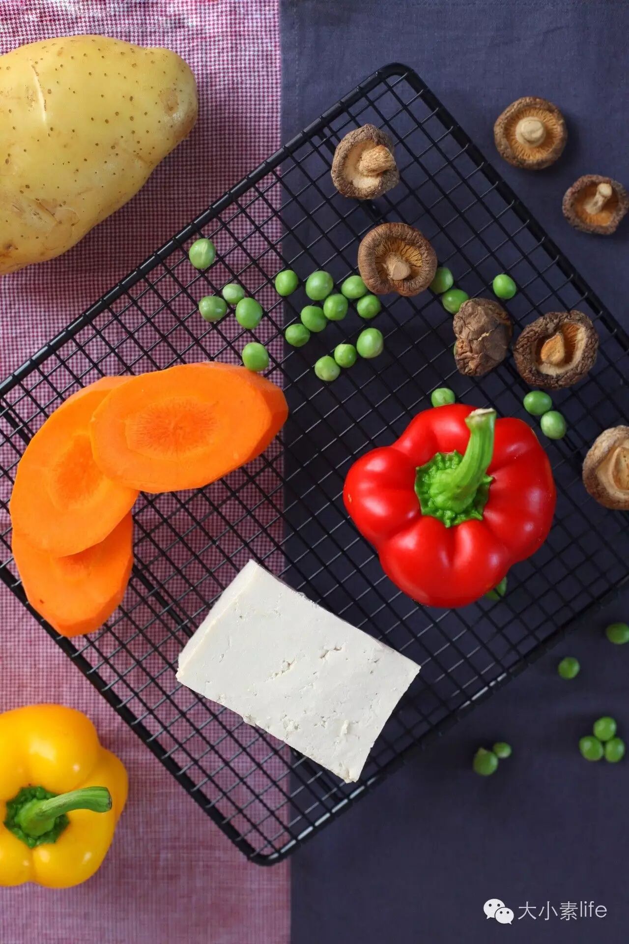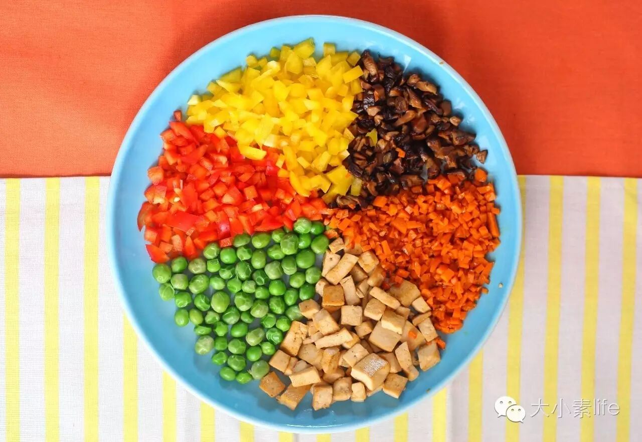 4、将红椒、黄椒洗净切丁,青豆用热水煮开捞出沥干,再用锅里下适量的植物油热油后,下红椒丁、黄椒丁、青豆一起翻炒,下的适量盐翻炒一会,出锅。最后将红椒丁、黄椒丁、青豆、香菇丁、豆腐丁、胡萝卜丁搅拌在一起,备用;(ps:味道的浓郁程度可根据自己喜爱进行调整)