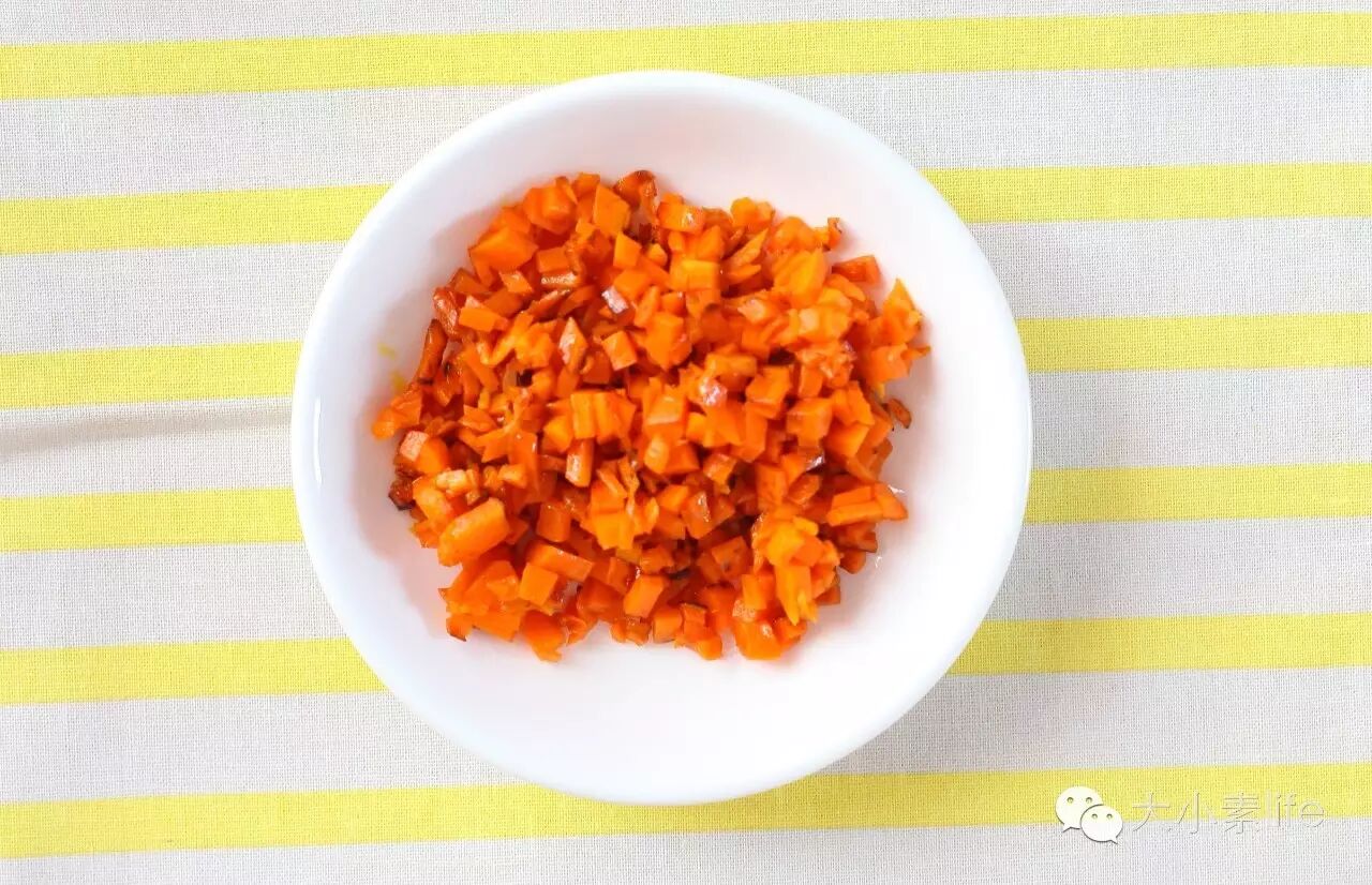 3、将胡萝卜洗净削皮,切细丁,在锅里下适量的植物油热油翻炒胡萝卜丁,再下适量的盐出锅,备用;