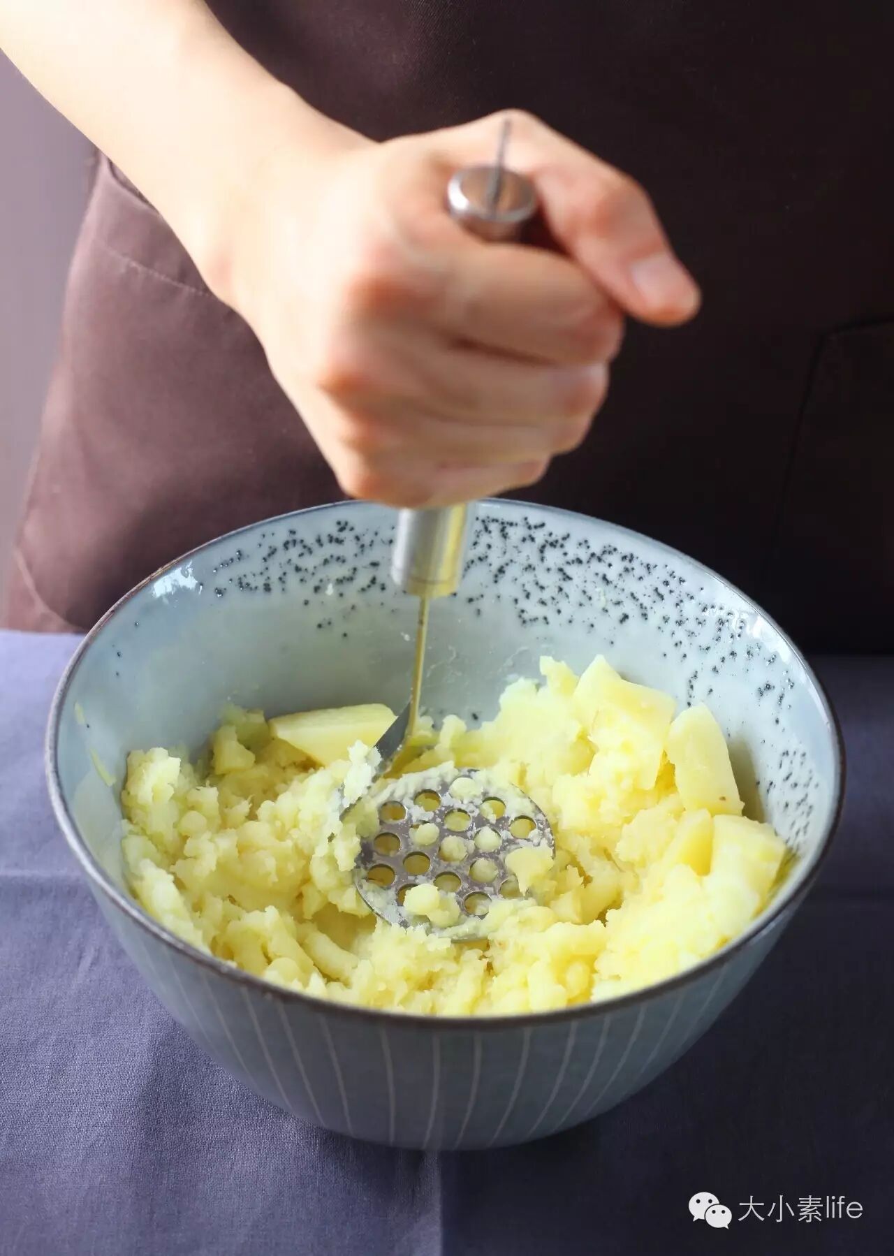 5、将土豆洗净削皮,切块,用蒸锅将土豆块蒸熟后捞出沥干晾凉,接着加入适量的盐在土豆里搅拌均匀后,用捣碎器将土豆捏碎成泥状,再用过筛网进行过筛,这样口感更加绵密,备用;