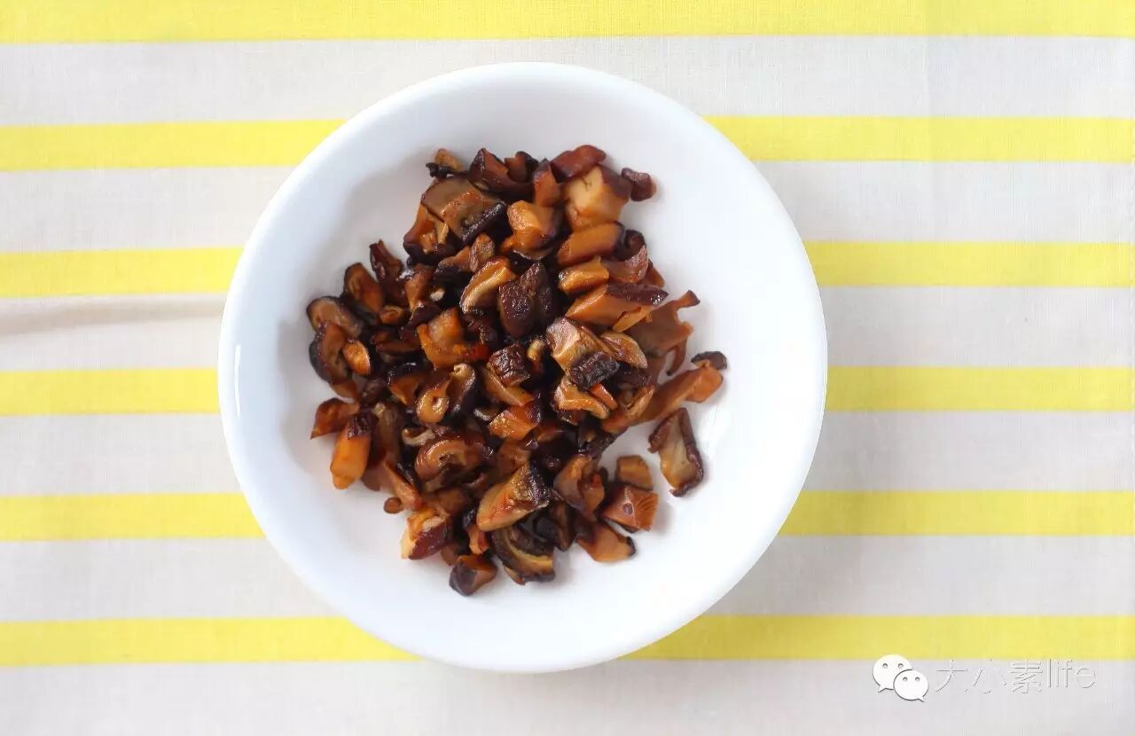 1、将香菇洗净用过滤水泡开,切细丁,用干锅干炒至香菇水分蒸发掉再下适量的植物油翻炒,接着下适量的酱油翻炒至香便可出锅,备用;(ps:味道的浓郁程度可根据自己喜爱进行调整。另外,有机酱油、香菇在“大小素”微店有售。)
