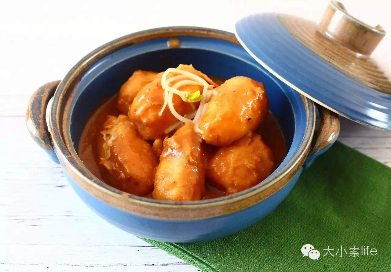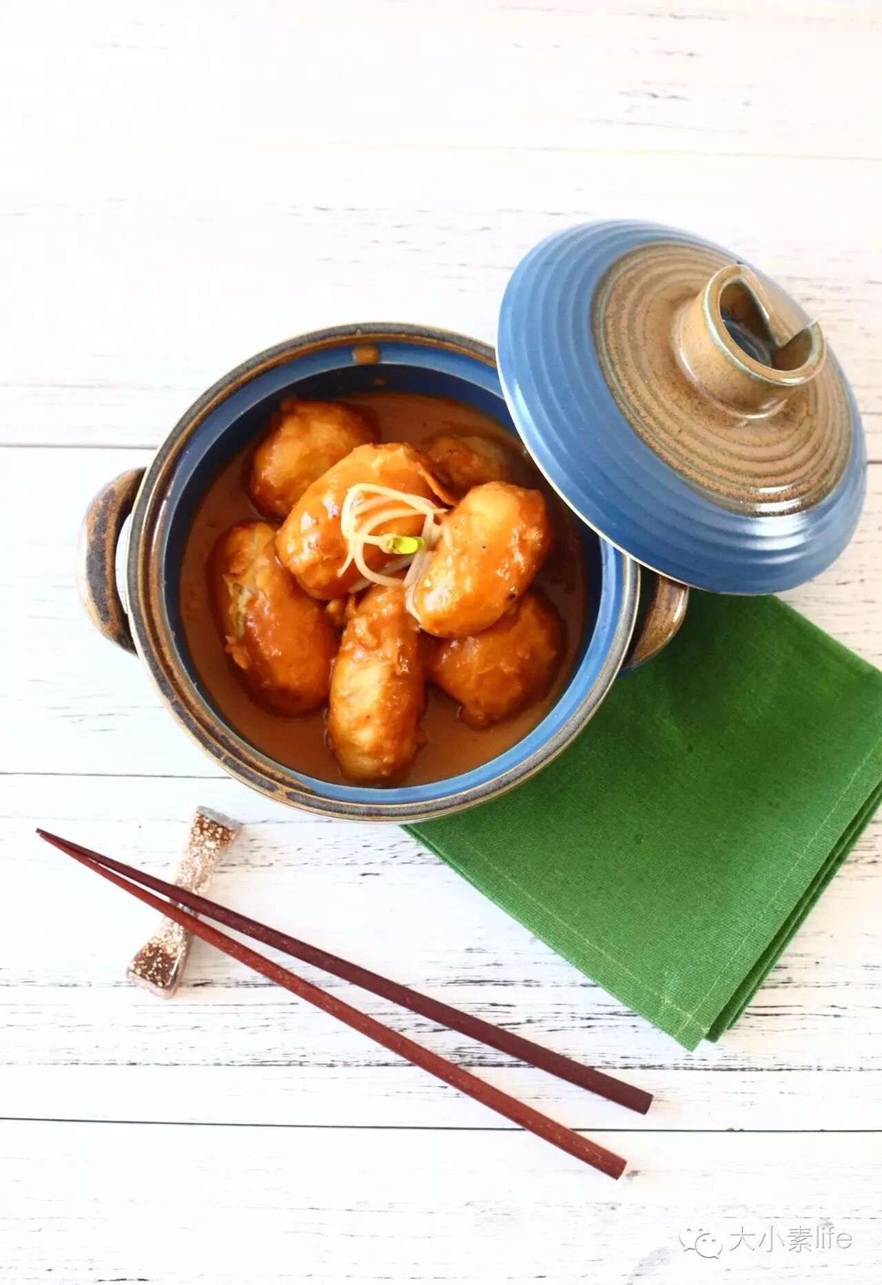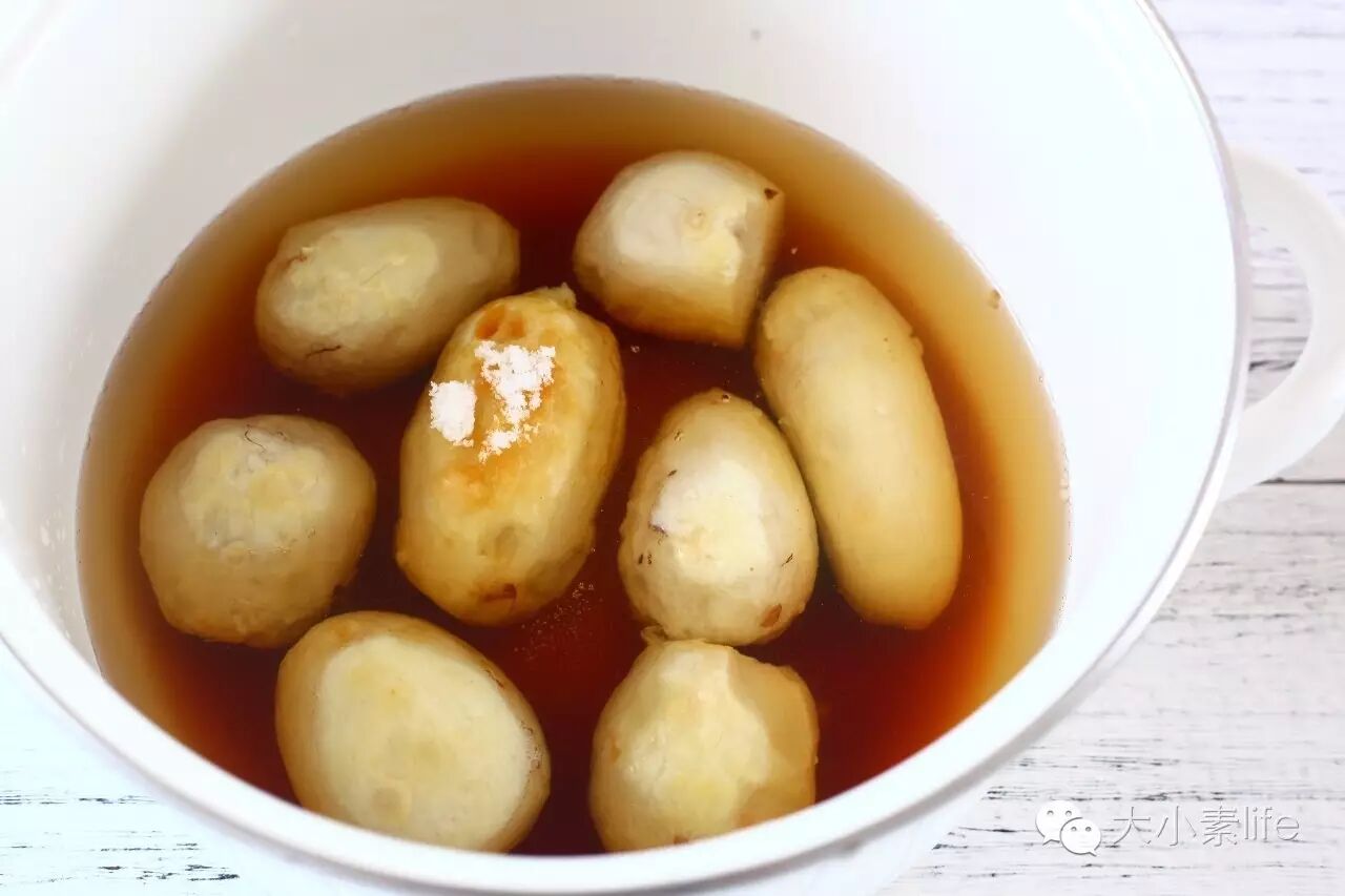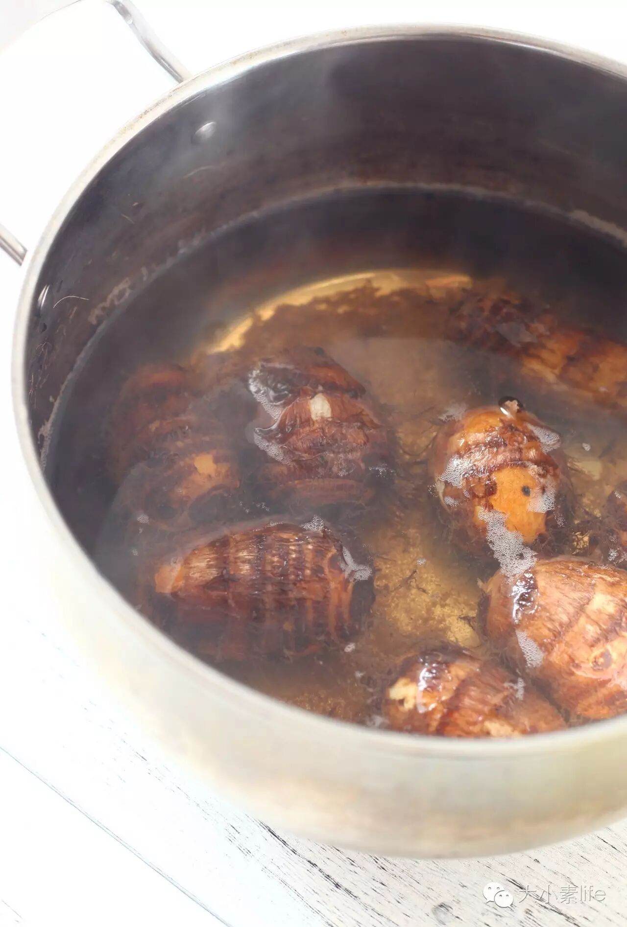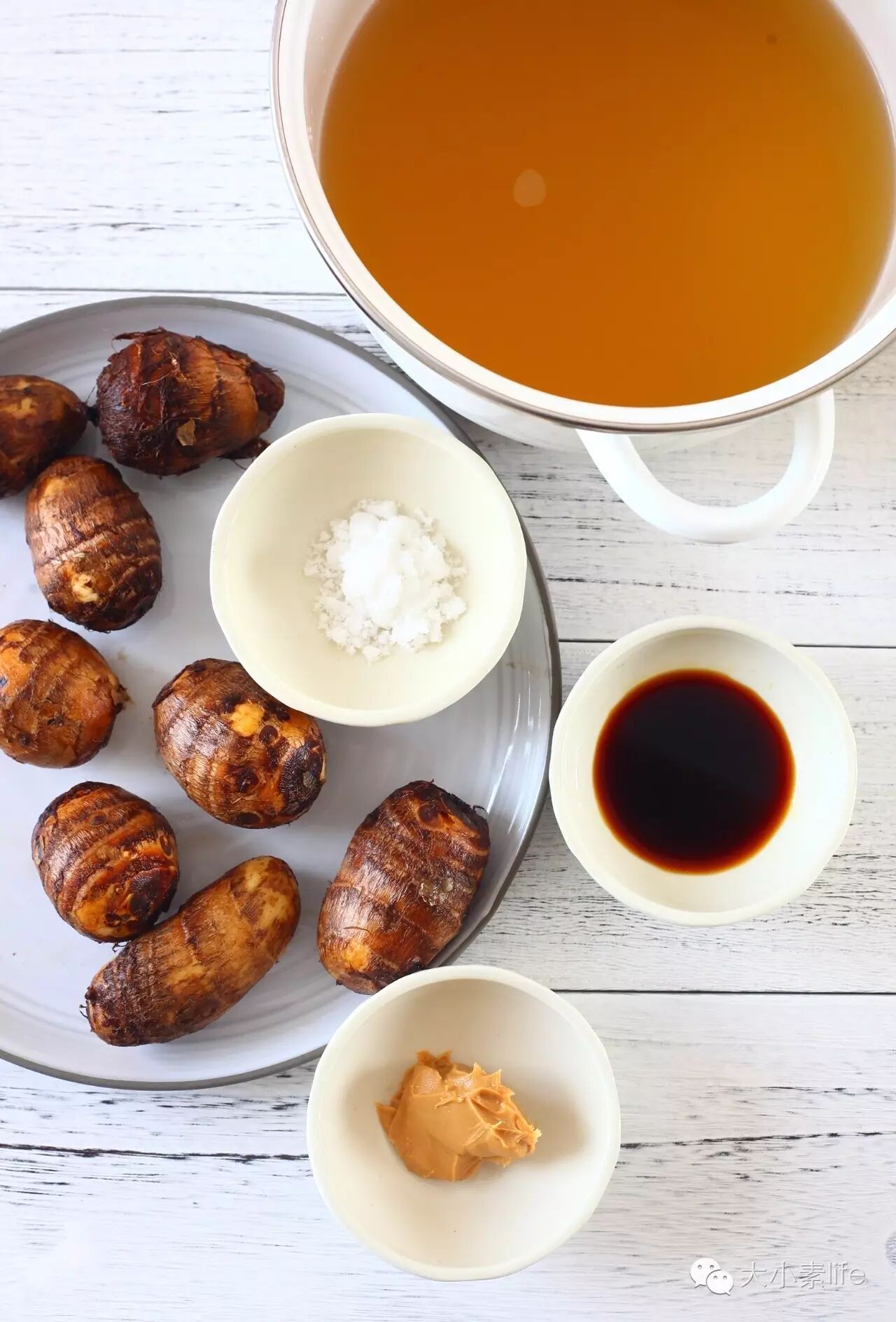 2、在锅里加进熬好的500g的素高汤、去皮的芋头、酱油、甜菜根糖大火煮开,转小火煮30分钟,期间要适当搅拌芋头,以免粘锅;