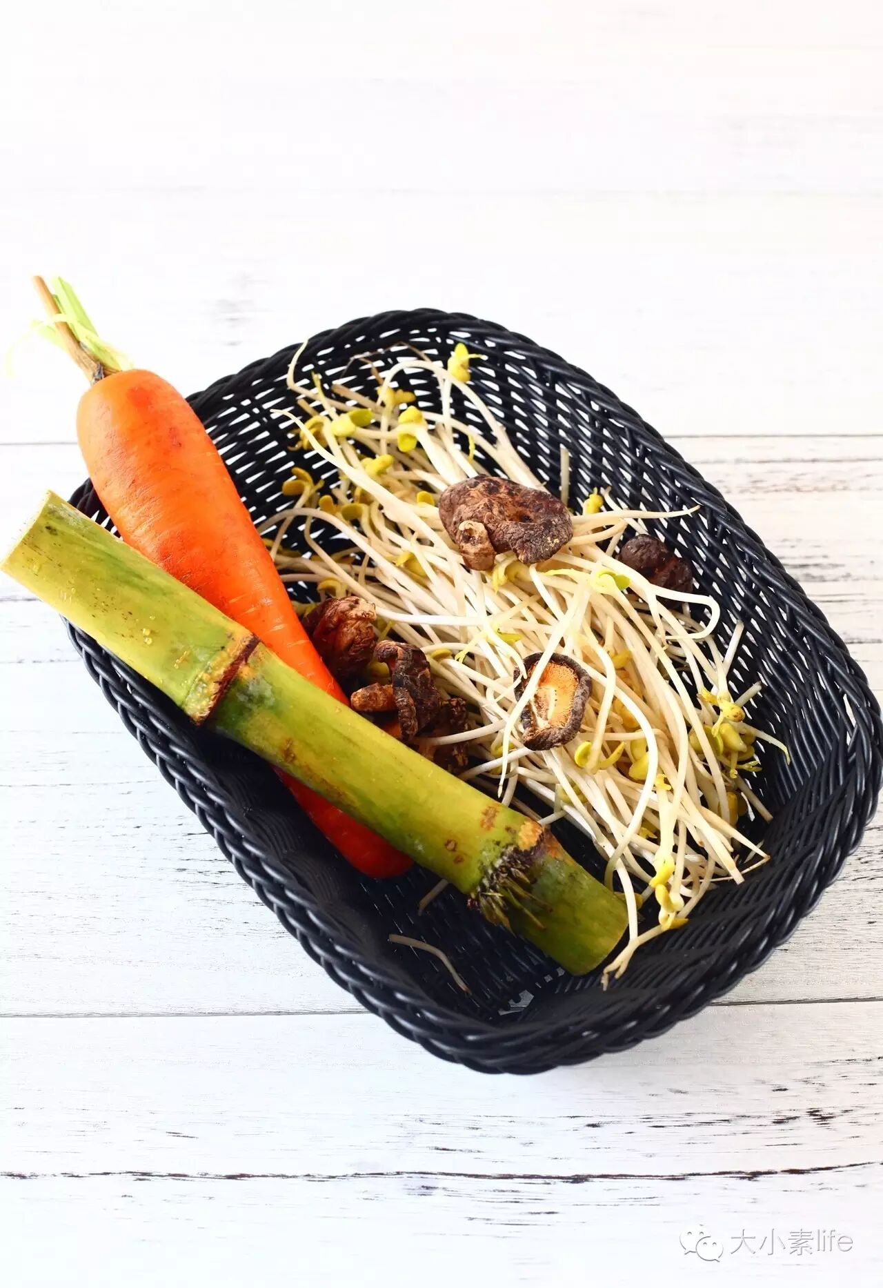 1、将甘蔗洗净切小条,胡萝卜洗净削皮滚刀切块,黄豆芽洗净切块,香菇洗净用过滤水泡开,切掉香菇蒂最硬的部分,留下香菇软的部分,将以上食材放进电压锅里,再加入10碗水进行熬煮30分钟,煮好后将汤渣捞出,剩下素高汤备用;