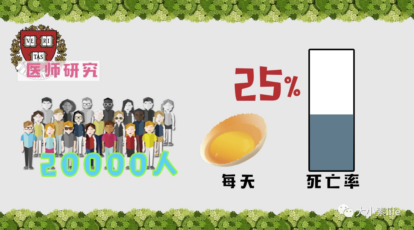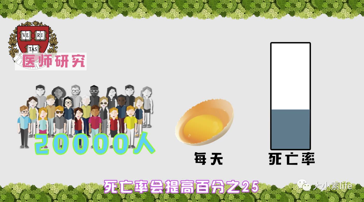 哈佛大学的医师健康研究跟踪了2万多志愿者20年,平均每天吃一个鸡蛋,死亡率会提高25%,换句话说,每天一个鸡蛋会短寿。