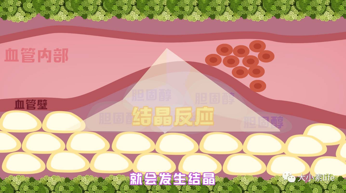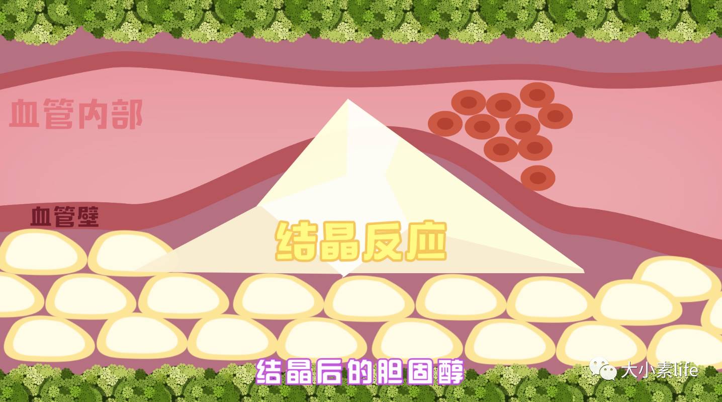 但胆固醇的浓度高到一定程度的时候就会发生结晶,结晶后的胆固醇就像一把利剑,会刺破血管内部细胞,从而释放斑块里面的物质,激发凝血的反应,导致血栓,很多的心梗和脑梗就是这么造成的。