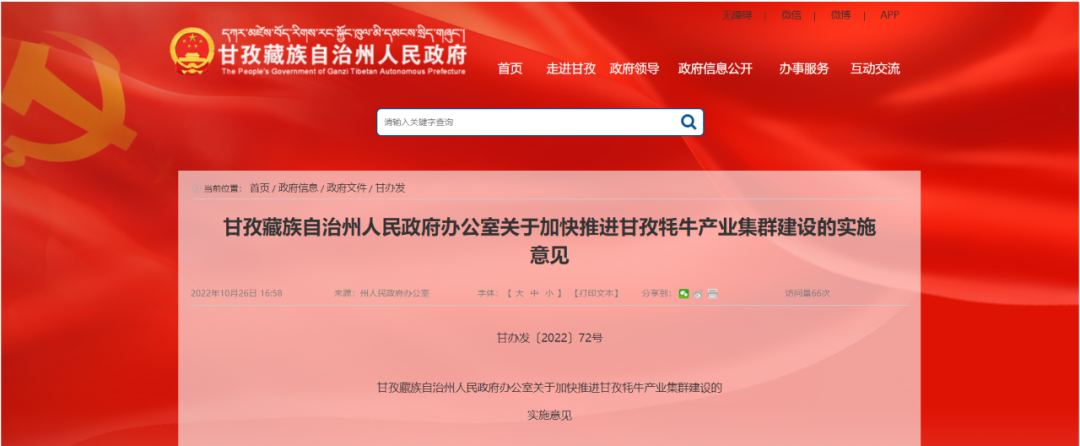 近日,从甘孜藏族自治州人民政府官方网站获悉:《甘孜藏族自治州人民政府办公室关于加快推进甘孜牦牛产业集群建设的实施意见》已经出台。
