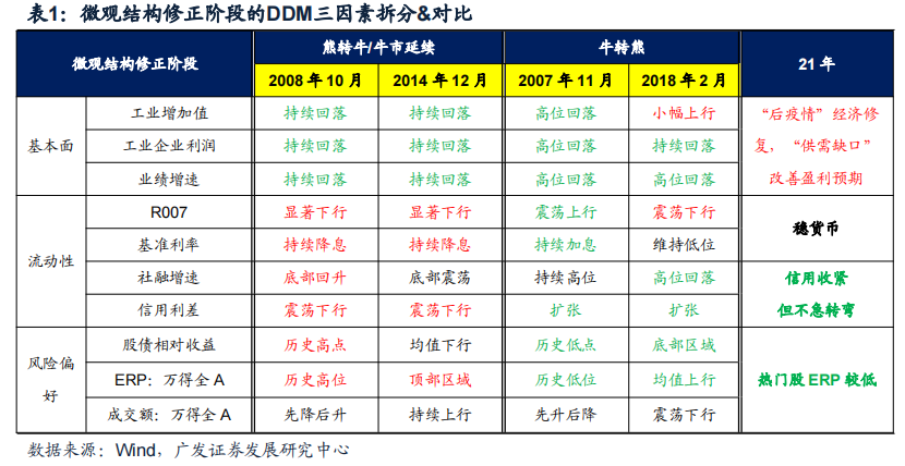 微观结构修正阶段,股市是否转牛/熊的关键在于流动性是否维持宽松。从历次微观结构修正阶段的市场来看,并不是每一次都指向了牛市的终结。复盘过去4轮微观结构修正阶段的DDM三因素,流动性是否维持宽松成为决定大势研判的胜负手。21年如果流动维持相对宽松,微观结构修正指向“风格切换”而非牛熊转换;但是如果流动性显著收紧,那么大概率会“牛转熊”。因此,后期市场的主要不确定性在于流动性的潜在变化方向和幅度。