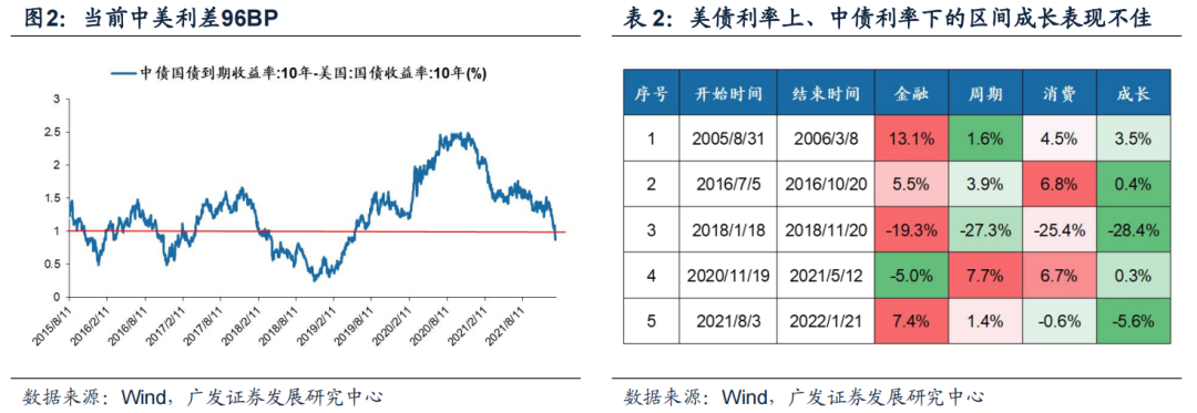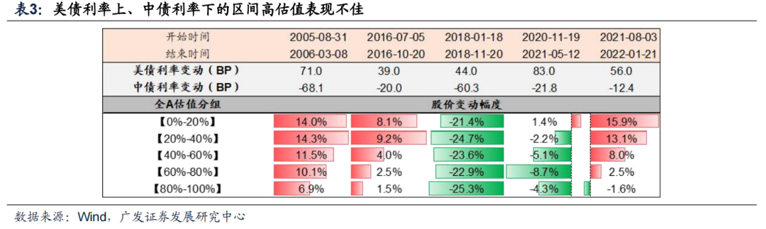 (3)结构上来看,美债利率上、中债利率下的区间成长表现均不佳。①15年“811”汇改后,A股成长股对于美债利率的敏感性强于国债:创业板与10年期美债利率的相关性达到-0.63,远高于与10年期中债利率的相关性-0.44;②除本轮外,历史上较为持续的美债利率上、中债利率下的区间有4次,期间四种风格中成长表现均不佳(2次最差,2次第3)、高估值股票受到显著的压制。