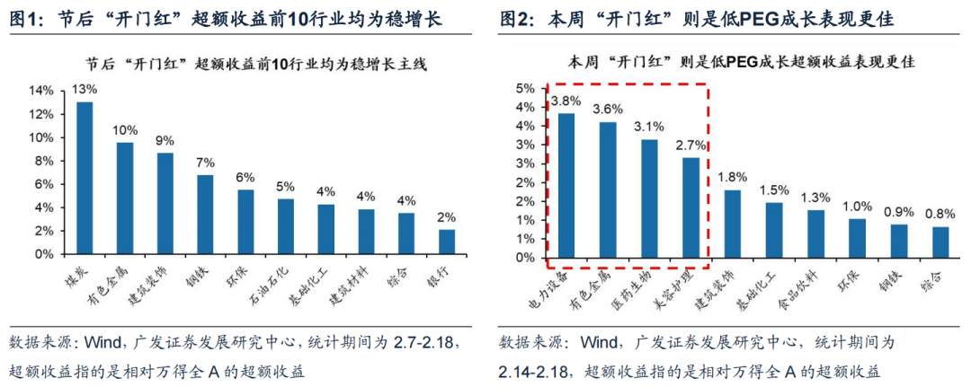 ● 本周A股延续虎年“开门红”。我们春节后提示“两大预期差”边际改善和绝对收益产品“负反馈”基本结束支撑了A股“开门红”延续,结构上稳增长和低PEG成长也交替表现。