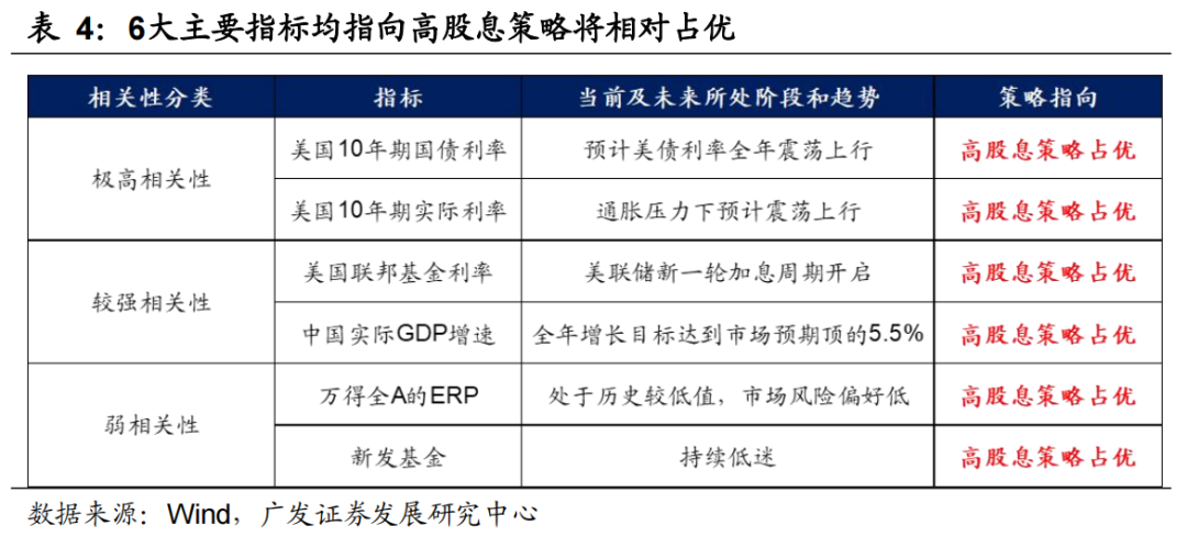 1. 极高相关性的两大指标均指向高股息策略相对占优。美国10年期国债利率和实际利率前期持续上行,而在美国通胀压力持续高企、美联储缩表指引愈发临近、美联储新一轮加息周期开启背景下,美国10年期国债利率和实际利率预计将持续维持高位甚至继续上行。从这两个指标来看,均指向高股息策略占优。