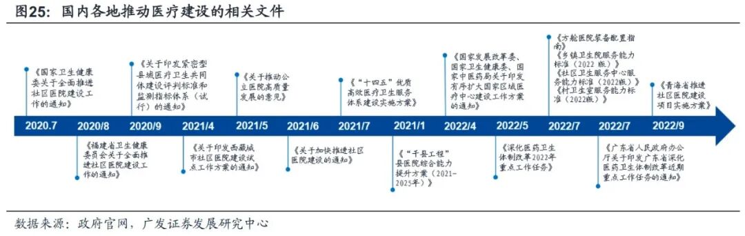 1、医疗新基建拉动医药产业快速扩容。2020年以来,我国发力医疗新基建,在各地掀起医院建设浪潮。2021年7月,多部委共同发布《“十四五”优质高效医疗卫生服务体系建设实施方案》。同年11月,卫健委颁发《“千县工程“县医院综合能力提升方案》,计划到2025年将至少1000家县医院的医疗服务能力提升至三级医院水平。今年7月,卫健委推出《方舱医院装备配置指南》,指出每个省至少要建设2-3家方舱医院。在同一个月,卫健委又制定了一系列基层卫生系统能力标准。多项政策发力,推动优质医疗资源扩容和区域均衡布局。