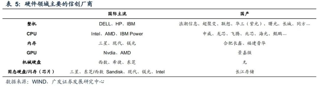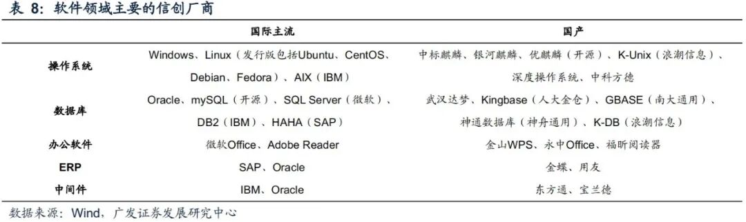 作为国内网络安全、数据安全基础,以及“新基建”的重要组成部分,信创产业规模庞大,具体包括:基础硬件(芯片及整机)、基础软件(操作系统、数据库、中间件)、应用软件(ERP、办公软件、OA等)、信息安全等。其中CPU及操作系统、数据库等高壁垒、高附加值的基础软硬件产品是完整信创生态中最核心环节。
