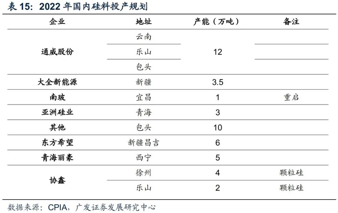 硅料集中投产拉动工业硅需求增长。据CPIA数据,2021年我国多晶硅产能达到62.3万吨,同比增加36.3%,产量约50.6万吨,同比增加27.8%。展望2022年,多晶硅产业规模将大幅增长,根据开工、设备订货、安装进度等情况测算,2022年以下项目将先后投产,包括:通威云南、乐山、包头3个项目共12万吨,大全新疆B线3.5万吨,宜昌南玻1万吨重启,亚洲硅业青海西宁3万吨,包头某多晶硅公司10万吨,东方希望新疆昌吉6万吨,青海丽豪西宁5万吨,协鑫徐州4万吨(颗粒硅)、乐山2万吨(颗粒硅)等。