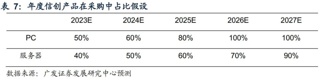 (3)考虑到正常情况下IT软硬件生命周期多为5年,同时以PC终端为主的办公系统与一般业务系统信创推进较快,服务器占比较高的生产制造研发系统信创推进相对较慢,我们假设23-27年政府与关基行业PC与服务器采购中信创产品占比如下: