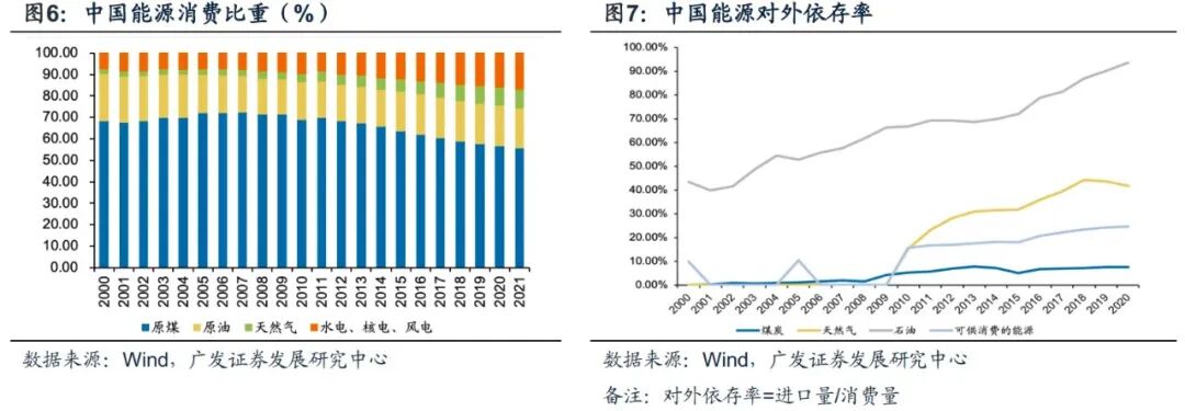 第一,从能源对外依存率看,我国能源消费中占比第二的原油对外依存率相对较高。根据Wind数据,自2000年以来,总体看中国可供消费的能源对外依存率水平维持在25%以下,其中,中国消费比重最大的原煤对应的煤炭对外依存率始终位于极低水平,在8%以下,消费比重第二的原油对应的石油对外依存率持续增长,达到了90%左右的高水平。