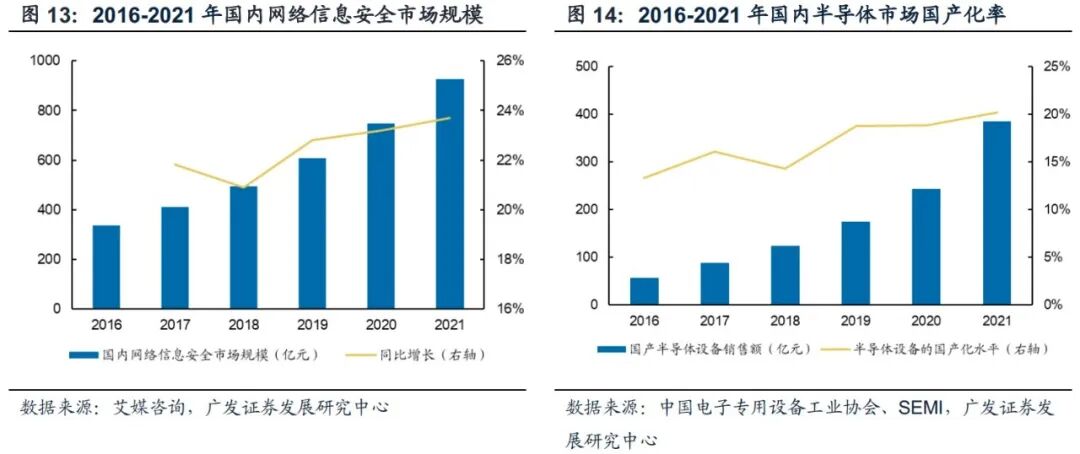 信息安全方面:从网络信息安全市场规模上看,我国网络安全规模增速高。根据艾媒咨询数据,2021年国内网络信息安全市场规模达到926.8亿元,连续五年保持20%-25%的高增速。