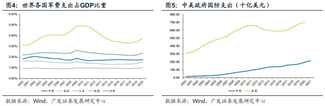 从军费支出看,中美差异和军队现代化下我国军费开支有望加码。现代化国防建设要求坚持机械化信息化智能化融合发展,加快军事人员现代化、武器装备现代化,这就要求军费支出的持续投入。我国在军费开支上低于美国,但近年来军费增长较快。根据Wind数据,2000年以来世界各国军费支出占GDP比重变化趋势基本一致,中国军费支出占GDP比重处于世界中等水平。根据叁肆数码数据,2022年我国军费预算为1.45万亿元,同比增长7.1%,美国则为7285亿美元,同比增长5.6%。