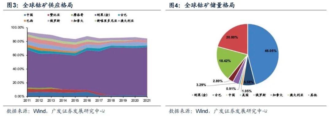 从对外依存度看,根据河北省自然资源厅,2021年我国钴对外依存度已接近99%。从主要进口来源看,我国钴原料进口高度依赖于刚果(金)。根据安泰科、中国海关总署,2020年我国钴湿法冶炼中间品在进口原料中占比88.9%,其中97.48%来自刚果(金)。从全球产储情况看,根据USGS,中国是世界上最大的钴消费国,刚果(金)钴矿产量占全球70%以上。中国是世界上主要的精炼钴生产国,其中大部分由从刚果(金)进口的部分精炼钴生产而来。USGS数据显示,刚果(金)贡献了钴产量的大部分增量,2021年刚果(金)钴矿产量约为12万公吨,占比70.59%(中国占比1.29%),储量占比46.05%(中国占比1.05%)。然而该国政局较为动荡,基础设施落后,供应具有不稳定性。此外,随着未来印尼中资红土镍矿项目落地,将贡献部分伴生钴产量。镍:依赖菲律宾和印尼,对外依存度长期保持在80%以上